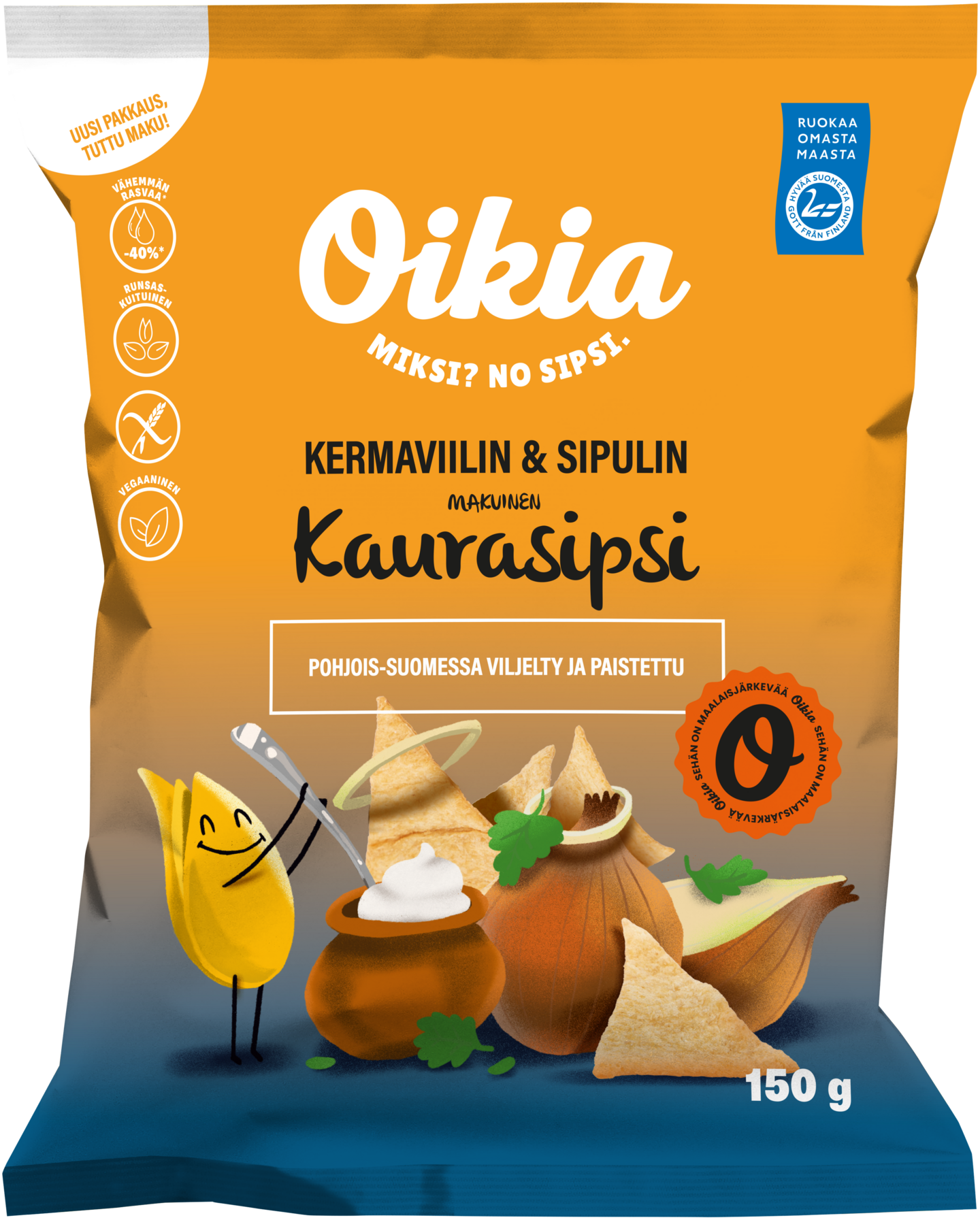 Rapea ja runsaskuituinen vegaaninen kaurasipsi, jossa täyteläinen kermaviilin ja sipulin maku kohtaavat. Valmistettu tehtaallamme Pyhännällä 100 % suomalaisesta täysjyväkaurasta ja pakattu kartonkikierrätettävään pussiin. Hyvää Suomesta -merkitty.