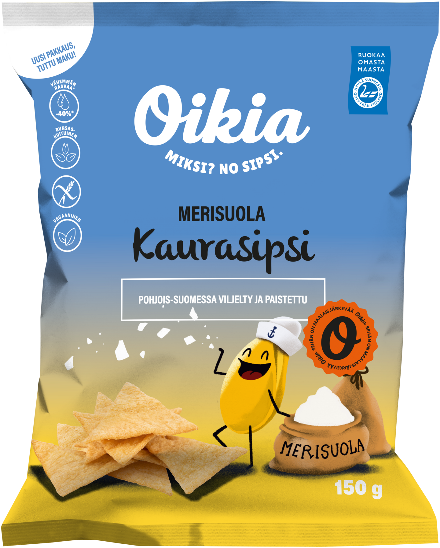 Kevyesti merisuolalla maustettu, rapea ja runsaskuituinen vegaaninen herkku. Valmistettu tehtaallamme Pyhännällä 100 % suomalaisesta täysjyväkaurasta ja pakattu kartonkikierrätettävään pussiin. Hyvää Suomesta -merkitty.