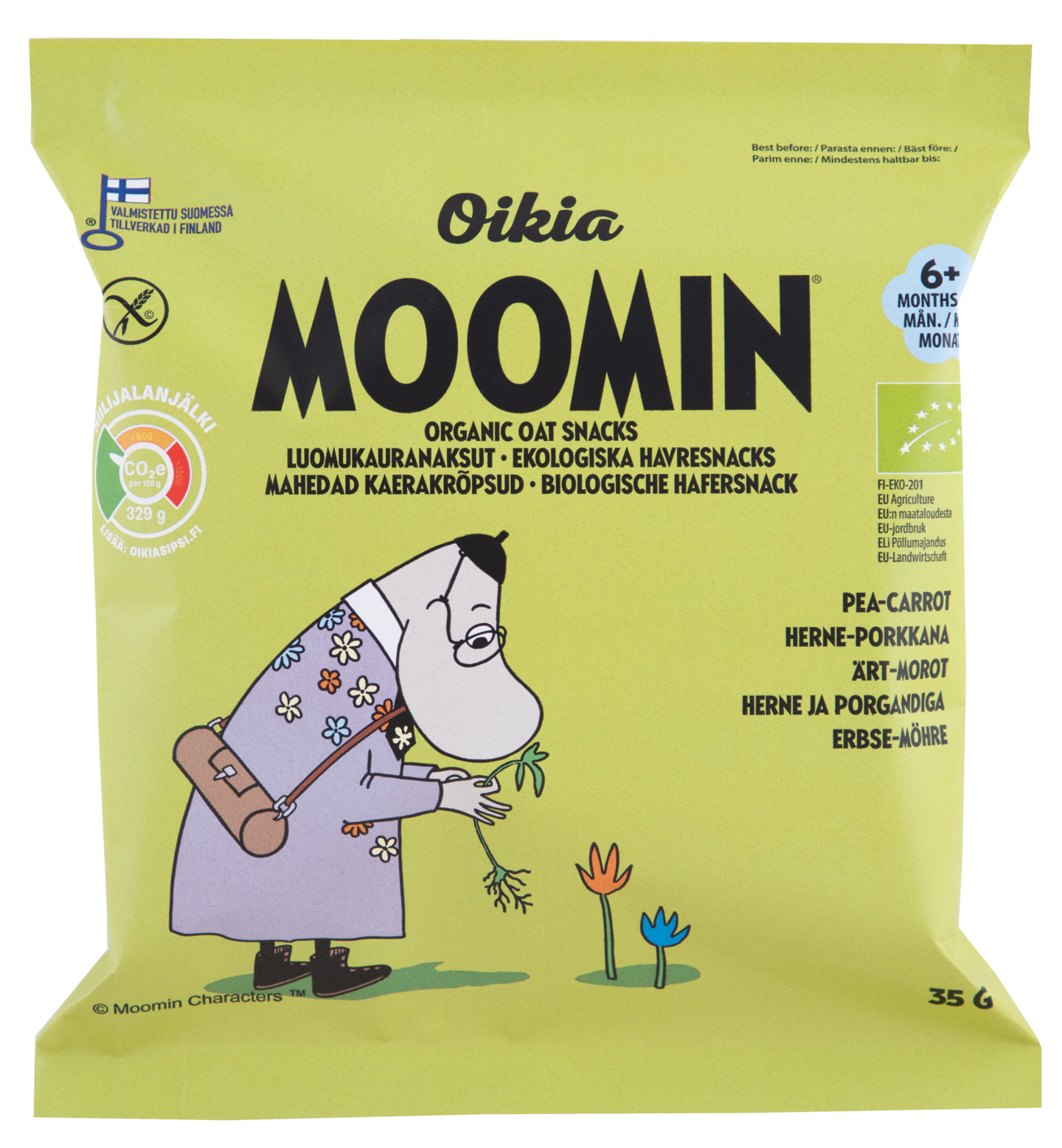 Oikia Moomin Luomukauranaksu herne-porkkana 35g 6+ kk