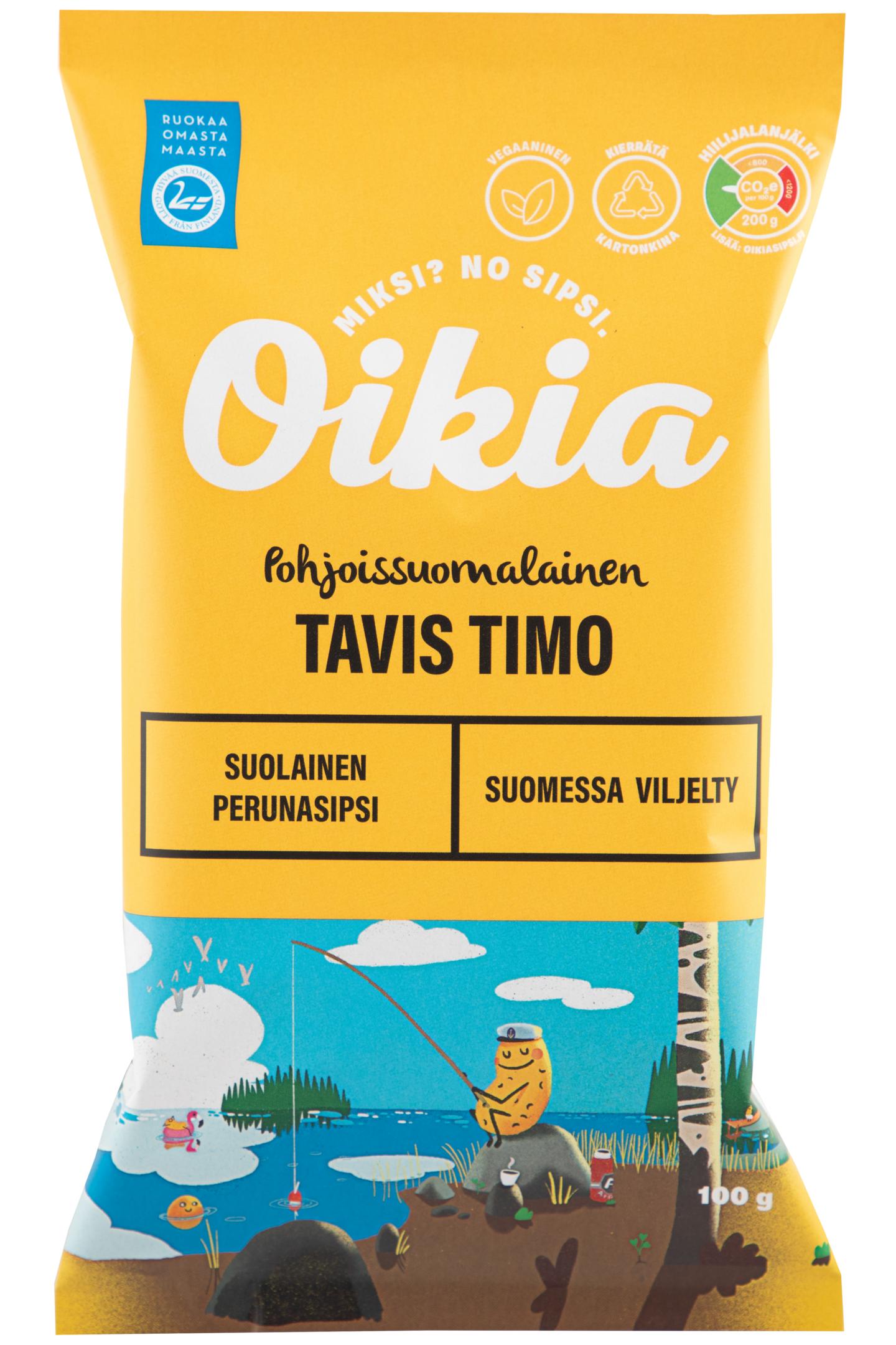 VegaaninenOikian sipsit valmistetaan kotimaisista pohjoisen perunoista. Jokaisessa pakkauksessa kerrotaan, missä sen sisältämät sipsiperunat on viljelty.