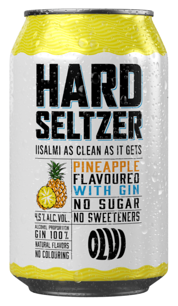 Suomen Hard Seltzer markkinan ensimmäinen ginipohjainen Hard Seltzer. OLVI Hard Seltzer Gin & Pineapple on raikas terästetty ja hiilihapotettu vesi, jossa maistuu raikas ananas. Tuote valmistetaan aitoon giniin ja on alkoholipitoisuudeltaan 4,5 %. Kaloripitoisuus on muihin juomasekoituksiin verrattuna pieni vain 25 kcal per 100 ml. Tuotteessa on 0 g sokeria, ei keinotekoisia makeuttajia eikä väriaineita ja sen valmistuksessa on käytetty ainoastaan luontaisia aromeja. OLVI Hard Seltzer Gin & Pineapple sopii nautittavaksi kylmänä sellaisenaan tai jäiden ja hedelmien kanssa.