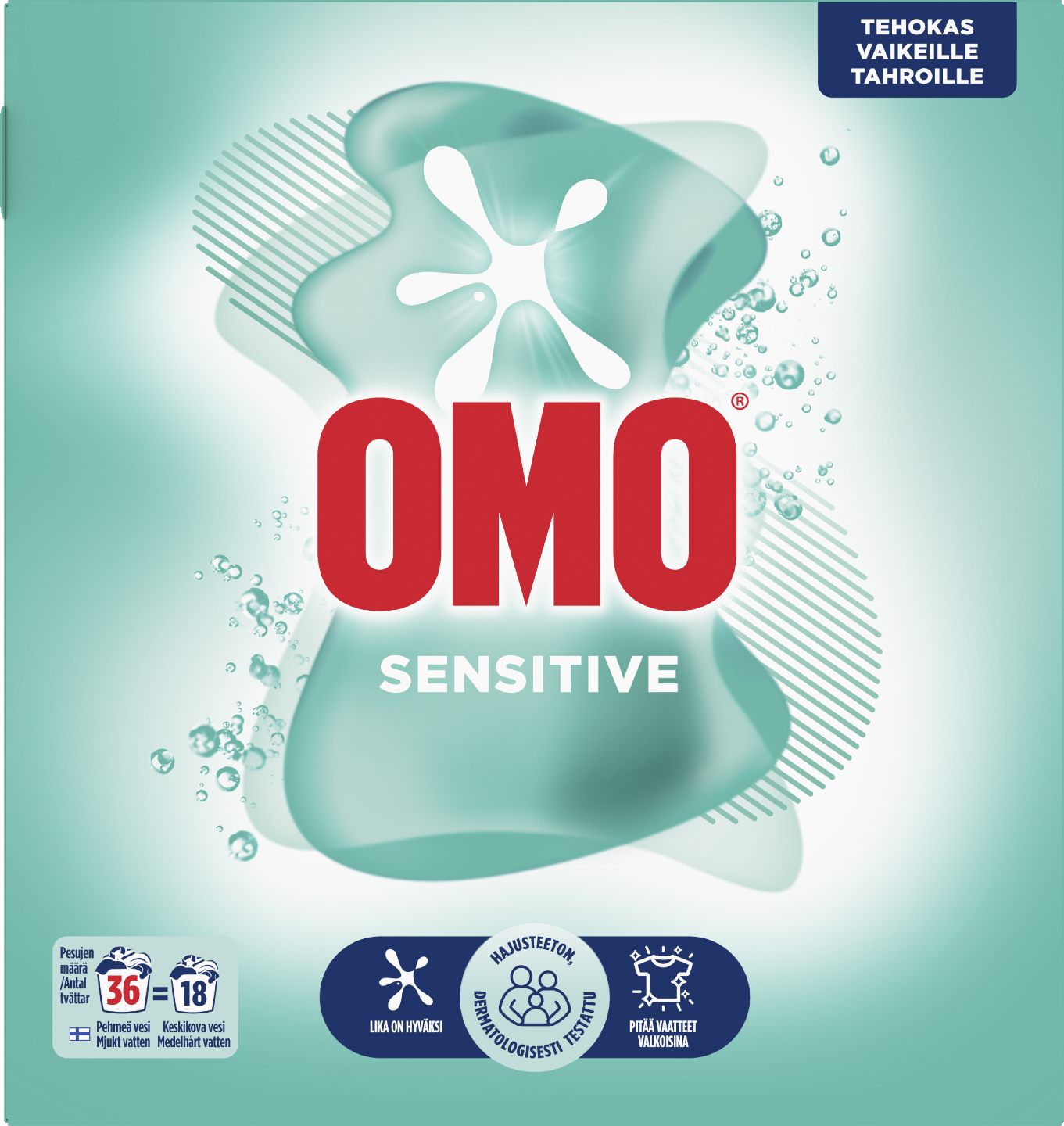 Omo Sensitive on pyykinpesujauhe, joka valmistetaan pohjoismaisessa tehtaassa, joka käyttää 100 % uusiutuvaa energiaa. Omo – Lika on hyväksi! Omo Sensitive -pesuaineen edut: • Hajusteeton • Poistaa tehokkaasti vaikeat tahrat • Sisältää kasvipohjaisia tahranpoistoaineita. • Säilyttää vaatteen värit. • Tehokas 30 °C:ssa. • Tehokas lyhyissä pesuohjelmissa. • Sopii herkälle iholle • Dermatologisesti testattu