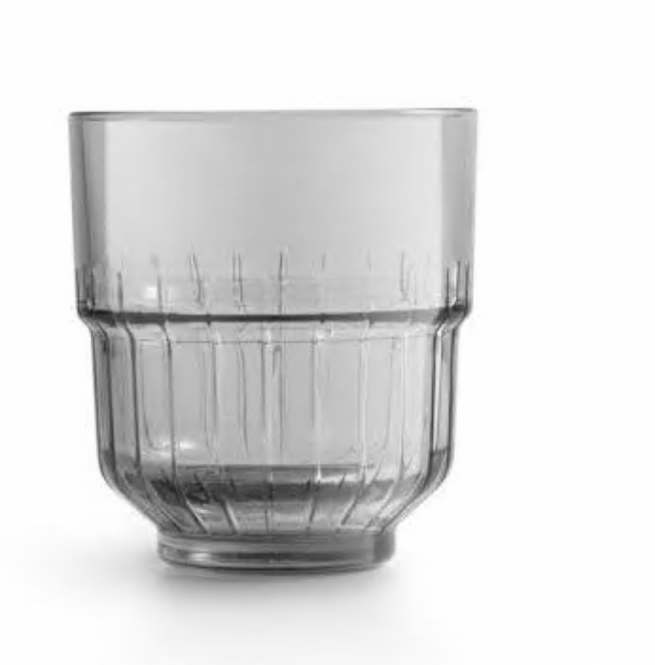 Tyylikäs, pinoutuva on the rocks -lasi. DuraTuff-kuumakäsiteltyä, läpikuultavan harmaata, kestävää lasia.