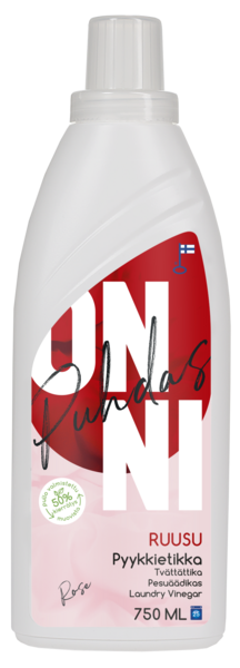 Puhdas ONNI Pyykkietikka Ruusu on luonnollisempi vaihtoehto huuhteluaineelle. Pyykkietikka poistaa sähköisyyttä, pehmentää ja raikastaa pyykin sekä kirkastaa tekstiilien värejä. Pyykkietikan käyttö puhdistaa pyykinpesukonetta ja putkistoa. Soveltuu kaikelle pyykille, myös teknisille urheilutekstiileille. Laimennettuna 1:10 pyykkietikka sopii yleispuhdistusaineeksi kodin puhdistukseen. Suomessa kehitetty ja valmistettu tuote, jolle on myönnetty Avainlippu -tunnus.
