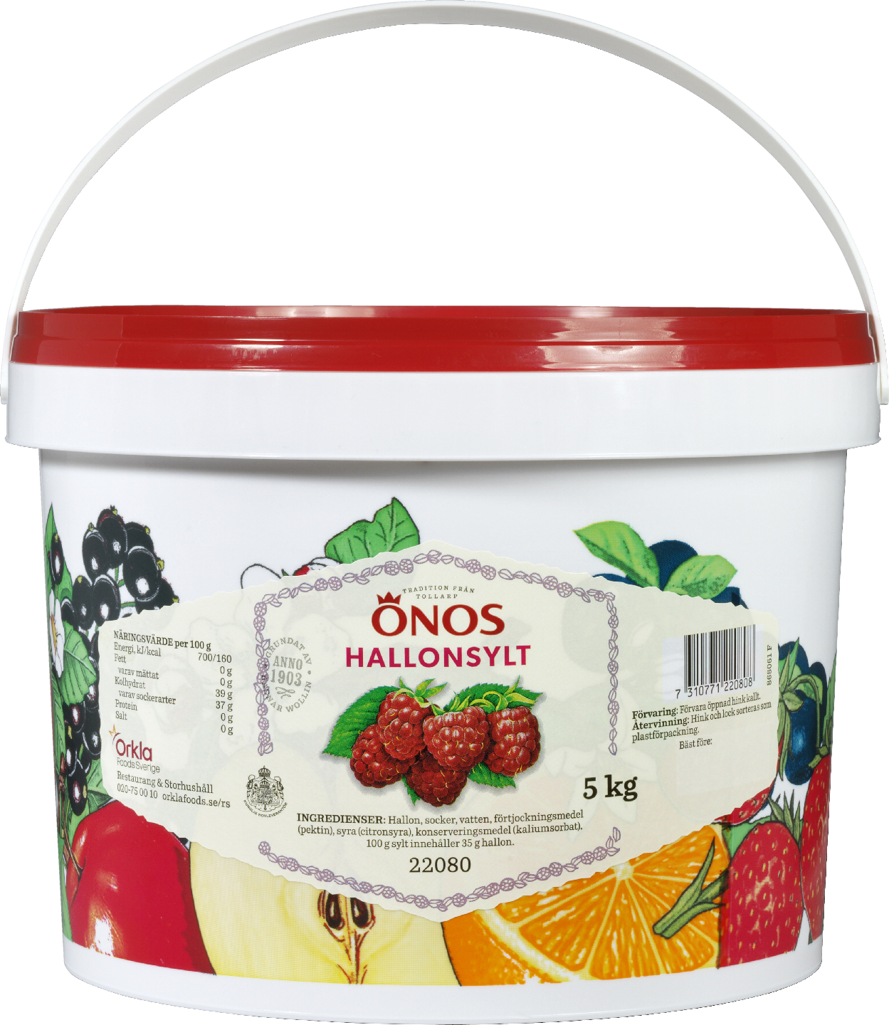 Vadelmat, sokeri, vesi, sakeuttamisaine (pektiini), happo (sitruunahappo), säilöntäaine (kaliumsorbaatti). 100 g hilloa sisältää 35 g vadelmia.