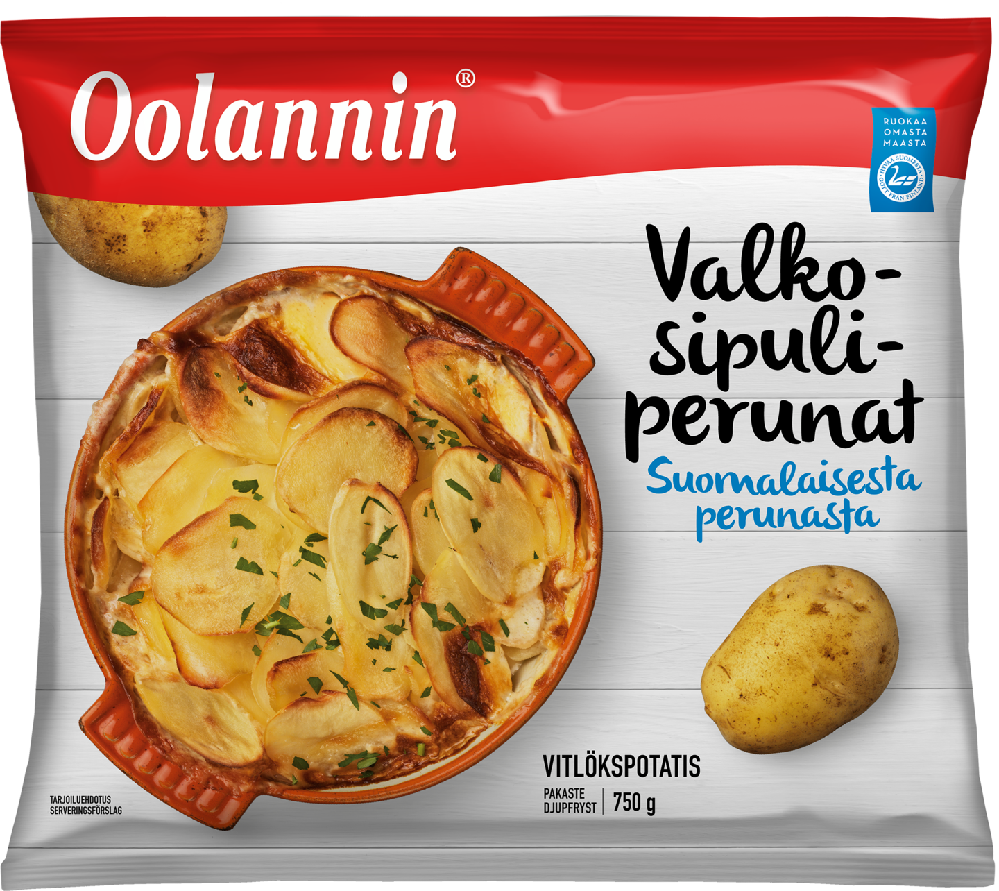 VegaaninenOolannin Valkosipuliperunat on suomalaisten perheviljelijöidemme kasvattamaa, puhdasta saaristolaisperunaa, johon lisäsimme ripauksen juhlan tuntua. Ensin valikoimme ne täydelliset perunat, jotka pesimme, sitten viipaloimme juuri sopivan kokoisiksi siivuiksi ja maustoimme valkosipulilla. Suomalainen peruna on hyvä syy kutsua läheiset saman pöydän ääreen herkuttelemaan. Suussa sulavan reseptin löydät aivan läheltä, tästä pussista.