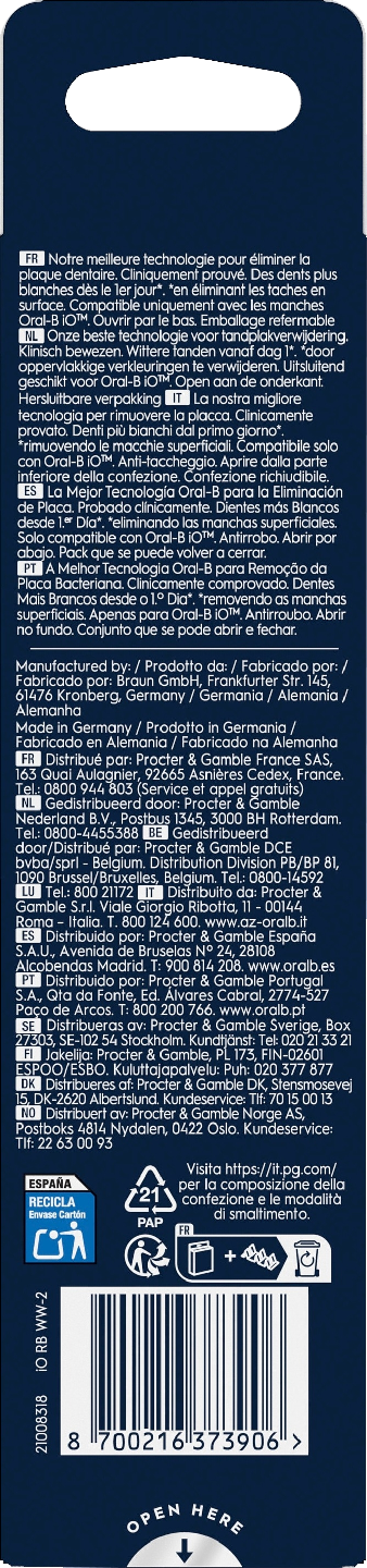 Oral-B iO Series Radiant White -vaihtoharjojen tehokkaat mutta hellävaraiset mikrovärähdykset sekä ainutlaatuinen, hammaslääkärien innoittama pyöreä harjaspää takaavat ammattimaisen puhtauden tunteen joka päivä. Erityisesti Oral-B iO -sähköhammasharjan varsia varten suunnitellut Radiant White -harjaspäät auttavat poistamaan jopa 100 % enemmän plakkia kuin tavallinen käsikäyttöinen hammasharja ja tekevät hampaista puhtaan tuntuiset ja hohtavat. Radiant White -harjaspään täydelliseen kulmaan asetetut harjakset ja kiillottavat liuskat ulottuvat kaikille alueille ja kiillottavat ne sekä poistavat pinnallisia värjäytymiä tehden hymystä valkoisemman. Hammaslääkärit suosittelevat vaihtamaan harjaspään 3 kuukauden välein parhaiden tulosten saavuttamiseksi. Nauti ylivoimaisesta puhdistustehosta ainoilla vaihtoharjoilla, jotka on suunniteltu yksinomaan Oral-B iO -sähköhammasharjaa varten ja jotka ovat taatusti yhteensopivia.