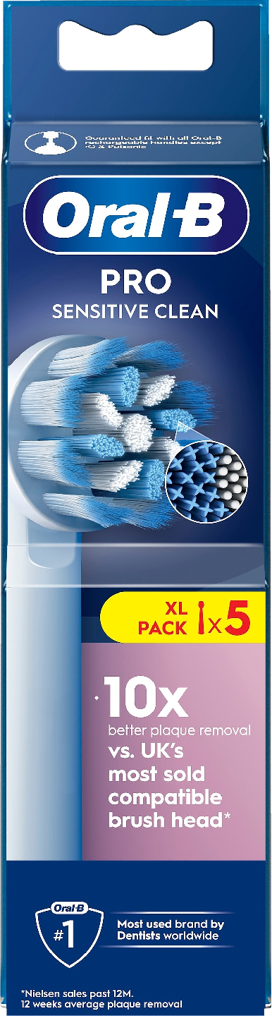 Oral-B Pro Sensitive Clean -harjaspäässä yhdistyy ikenille hellävaraiset, erittäin pehmeät harjakset ja tavalliset harjakset, jotka ovat armottomat plakille. Se poistaa jopa 100 % enemmän plakkia ja vähentää ientulehduksia 100 % verrattuna käsikäyttöiseen hammasharjaan. Aidoissa Oral-B-harjaspäissä on uudet X:n muotoiset harjakset, jotka puhdistavat alueet, joihin pyöreät harjakset eivät yllä. Harjaspään kulumisen ilmaisin muuttaa harjakset vihreästä keltaiseksi, kun on aika vaihtaa harjaspää, mikä takaa aina 100 % puhdistustehon. Yhteensopiva ladattavien Oral-B-sähköhammasharjojen kanssa Pulsonic- & iO-sähköhammasharjoja lukuun ottamatta.