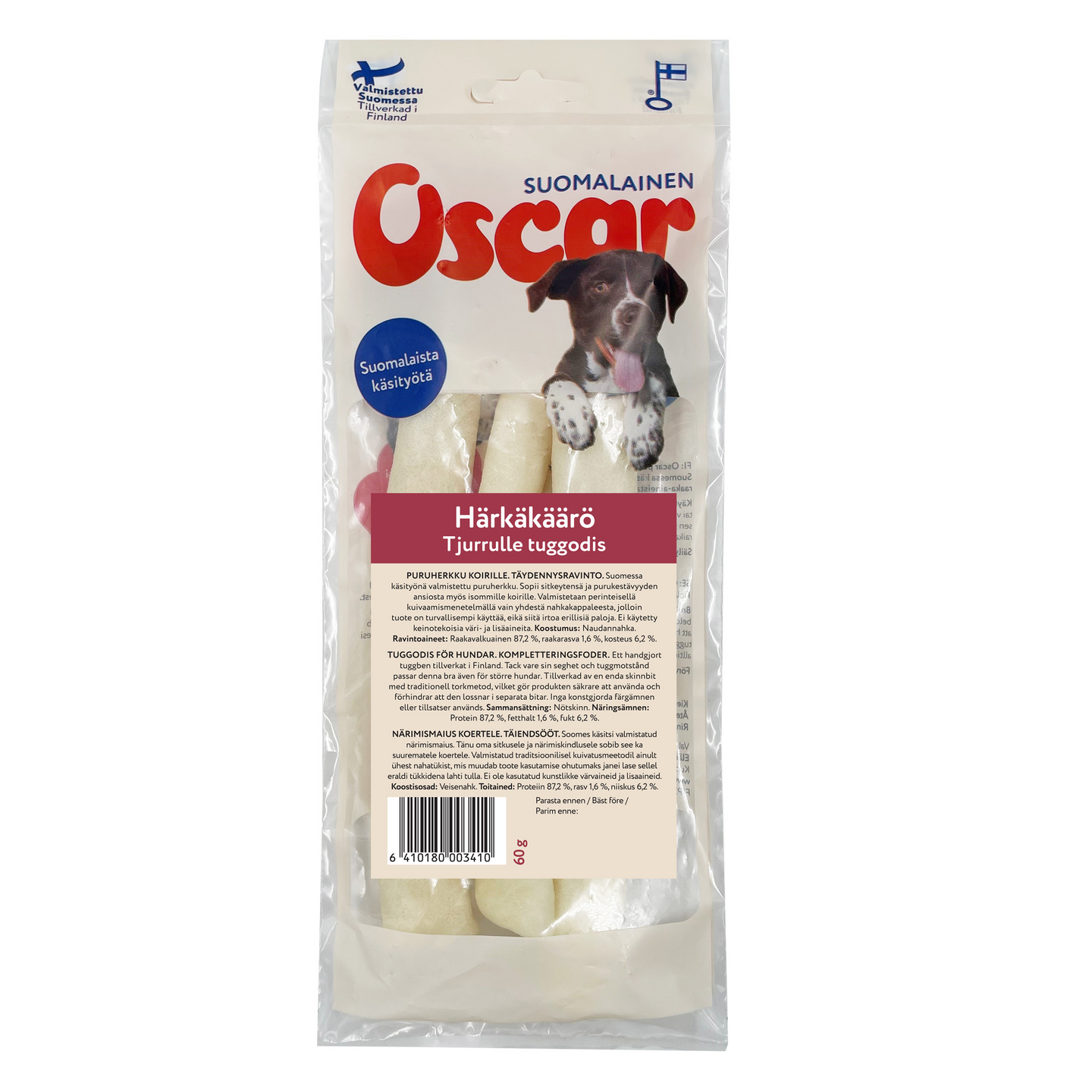 Valmistettu Suomessa perinteisellä kuivaamismenetelmällä naudannahasta käsityönä, vain ensiluokkaisista raaka-aineista ja ilman lisäaineita. Valmistetaan aina vain yhdestä nahkakappaleesta, jolloin tuote on turvallisempi, eikä siitä irtoa "paloja". Oscar nautapuruherkkujen nahka on aina ensisijaisesti kotimaista, mutta saatavuuden vuoksi käytämme välillä myös Pohjoismaista ja EU:n alueelta saatavia nahkoja.