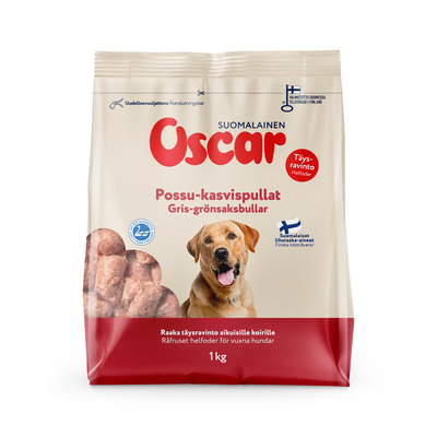 Kotimainen täysravinto koirille. Helposti annosteltava raakaruoka sisältää kaikki aikuisen koiran päivittäin tarvitsemat ravintoaineet maittavimmassa ja luonnollisimmassa muodossa. Tuote sisältää suomalaista possua ja suomalaisia kasviksia. Ei sisällä viljaa, verta, säilöntä- tai väriaineita. Raakaruoassa koiran tarvitsemat ravintoaineet säilyvät luonnollisesti, ja koiran elimistö saa hyödynnettyä ne tehokkaammin. Tämä edesauttaa turkin, ihon, hampaiden ja kynsien hyvinvointia ja normalisoi immuunijärjestelmää. Oscar täysravintoihin on lisätty myös kaikki tarvittavat ravintoaineet, joita koira ei lihasta saa. Pakkaus on uudelleensuljettava, joten annostelu on todella helppoa! Hyvää Suomesta- ja Avainlippu - merkit pakkauksessa takaavat tuotteen korkean laadun.