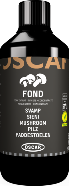 VegaaninenIntensiivinen OSCAR® Sienifondi tiiviste maistuu vahvasti umamilta. Se erottuu muista vastaavista fondeista, koska sen valmistamisessa on käytetty voimakas aromisia siitakkeen ja tattien kaltaisia sieniä. OSCAR® Sienifondi tiiviste tarjoaa runsaasti käyttömahdollisuuksia esimerkiksi kasvisruokien valmistuksessa, mutta se toimii myös aromien pohjana antaen syvyyttä ja umamia esimerkiksi kastikkeissa. Sitä voi käyttää kylmiin ja lämpimiin ruokiin, kuten risottoihin, kastikkeisiin, keittoihin ja erilaisiin dippeihin. Kokeile yhdistää OSCAR® Sienifondi tiiviste ja OSCAR® Riistafondi tiiviste herkullisen riista-kastikkeen pohjaksi.