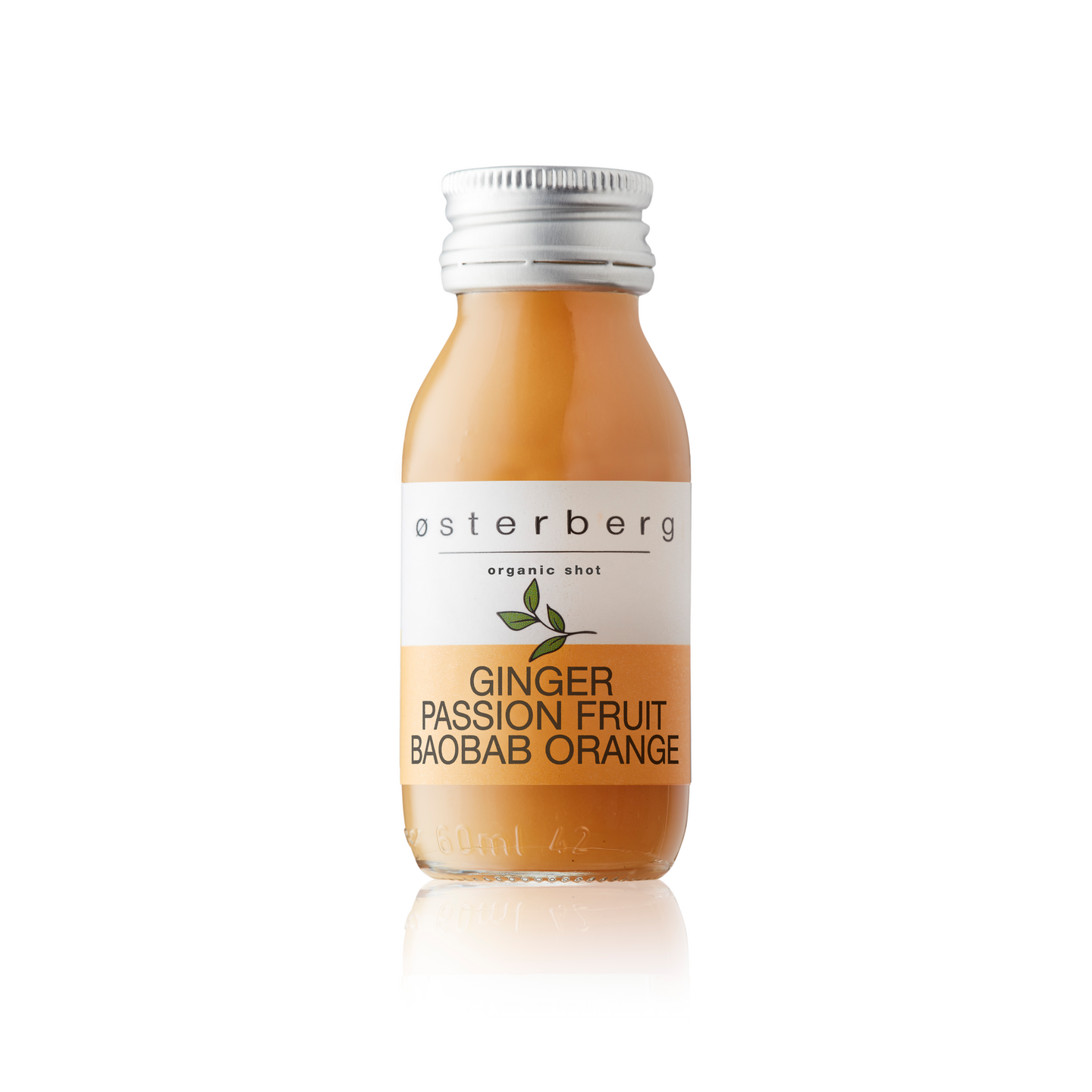 luomu omenamehu*, luomu inkiväärimehu (25%), luomu passionmehu (12%), luomu appelsiinimehu (8%), luomu banaanisose, luomu baobab-jauhe (3%). Pastöroitu. * tiivisteestä, Luonnollinen sakka sallittua.