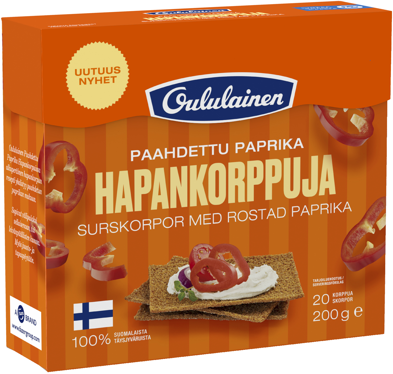 VegaaninenOululainen Hapankorppu paahdettu paprika on maukas suomalainen hapankorppu, jonka maku tulee rukiista ja paahdetusta paprikasta. Hapankorppu paahdettu paprika on erinomainen välipala, joka sopii arkeen ja juhlaan. Leivottu Suomessa taikinajuuresta ja 100% suomalaisesta täysjyvästä sekä on runsaskuituinen ja ilman lisäaineita.