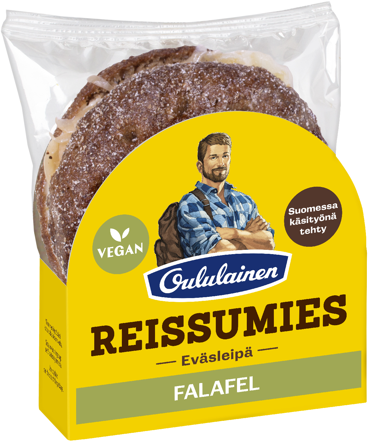 VegaaninenNappaa mukaasi valmiit eväät! Reissumies Eväsleipä Falafel tarjoaa kätevän ratkaisun kiireiseen arkeen välipalaksi tai lounaaksi. Täysjyväruisleipä, ruokaisa falafelpihvi, kevyesti inkiväärillä maustettu coleslaw ja vegaaninen chilimajoneesi on raikas yhdistelmä, joka maistuu myös vegaanista ruokavaliota noudattavalle. Valmistettu Suomessa.