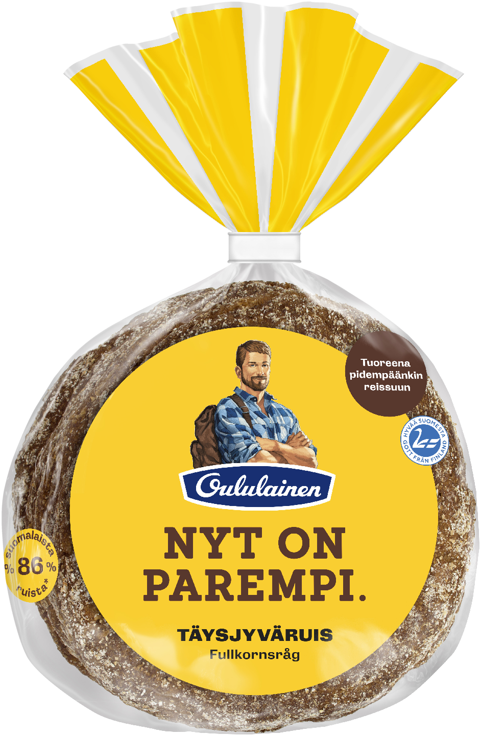 VegaaninenReissumies nyt tuoreena pidempäänkin reissuun! Reissumiehessä leivän mehevyys ja rukiinen maku ovat aiempaakin paremmat. Reissumiehen tunnistettava pyöreä klassikkoruisleipä on hurmannut suomalaisia jo vuodesta 1978 saakka. Se on täyteläisen rukiinen ja rakenteeltaan sopivan pehmeä leipä, joka antaa luonnollista energiaa ja tsemppiä jaksaa eteenpäin. 86% leivän viljasta on täysjyväruista. Proteiininlähde. Leivottu Lahdessa kotimaisesta viljasta aitoon taikinajuureen.