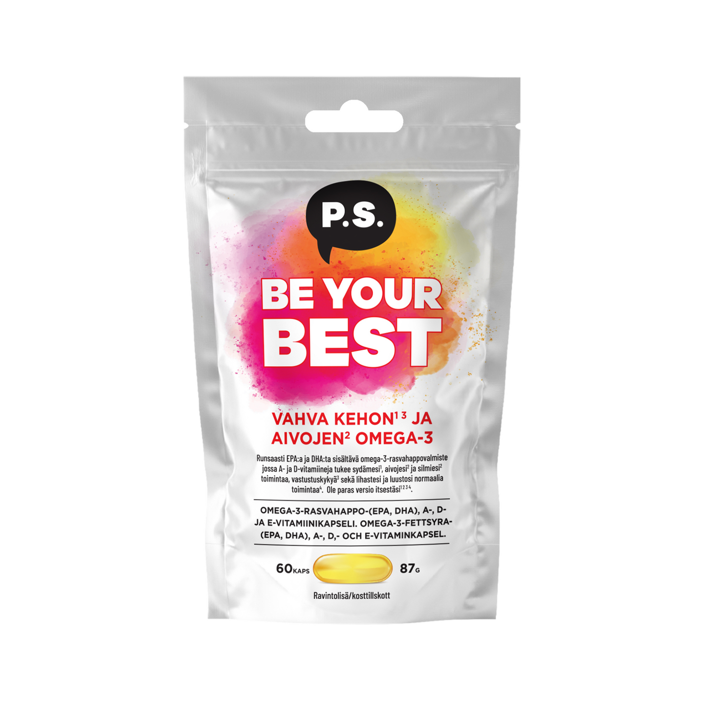 MaidotonTässä tulee P.S. Nutrition – uusi ravintolisäsarja! Be Your Best on ravintolisä, joka auttaa sinua ottamaan päivästäsi ja elämästäsi kaiken irti! Korkealaatuisesta kalaöljystä saatu Omega-3 sisältää sydäntä suojaavia EPA- ja DHA-rasvahappoja sekä immuniteettiasi vahvistavia A- ja D-vitamiineja. Nämä ainesosat tehostavat treenejäsi, päivääsi ja kokonaisvaltaista hyvinvointiasi.
