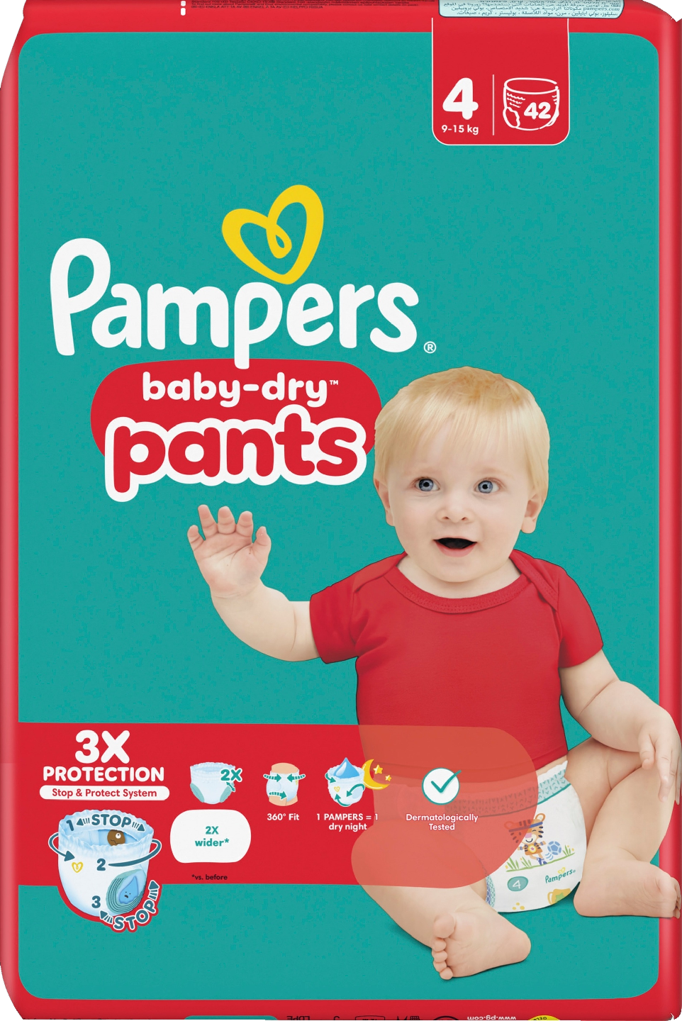 Kun vauvasi alkaa liikkua enemmän, kannattaa valita vaippa, joka mukautuu uusiin liikkeisiin. Mullistavan Stop & Protect -järjestelmän ansiosta Pampers Baby-Dry -housuvaipat tarjoavat ylivoimaisen vuotosuojan koko vaipan alueella vauvan asennosta riippumatta – päivällä ja yöllä! Pampers Baby-Dry -housuvaippojen Stop & Protect -järjestelmä sisältää: 2 kertaa leveämmät* jalansuut ehkäisevät vuotoja jalkojen ympärillä, tasku auttaa ehkäisemään ohivuotoja vaipan takaosassa, 360° joustava vyötärö mukautuu vauvasi kehoon hänen liikkuessa ja erittäin imukykyinen ydin tarjoaa jopa 12 tunnin suojan. Kuten kaikkien Pampersin housuvaippojen, myös Pampers Baby-Dry -housuvaipan vaihtaminen on helppoa, vaikka vauva kiemurtelisikin: vedä päälle yhdellä liikkeellä, riisu repäisemällä sivut auki ja hävitä helposti käärimällä rullalle ja kiinnittämällä teipillä. Vanhempien tapaan Pampers asettaa lasten turvallisuuden kaiken muun edelle: Pampers Baby-Dry -housuvaipat ovat dermatologisesti testattuja ja Skin Health Alliancen ihotautilääkäreiden hyväksymiä. Ne ovat myös OEKO-TEX Standard 100 -sertifioituja. Haluatko tietää lisää Pampersin käyttämistä materiaaleista? Käy osoitteessa pampers.fi. *verrattuna aiempaan.