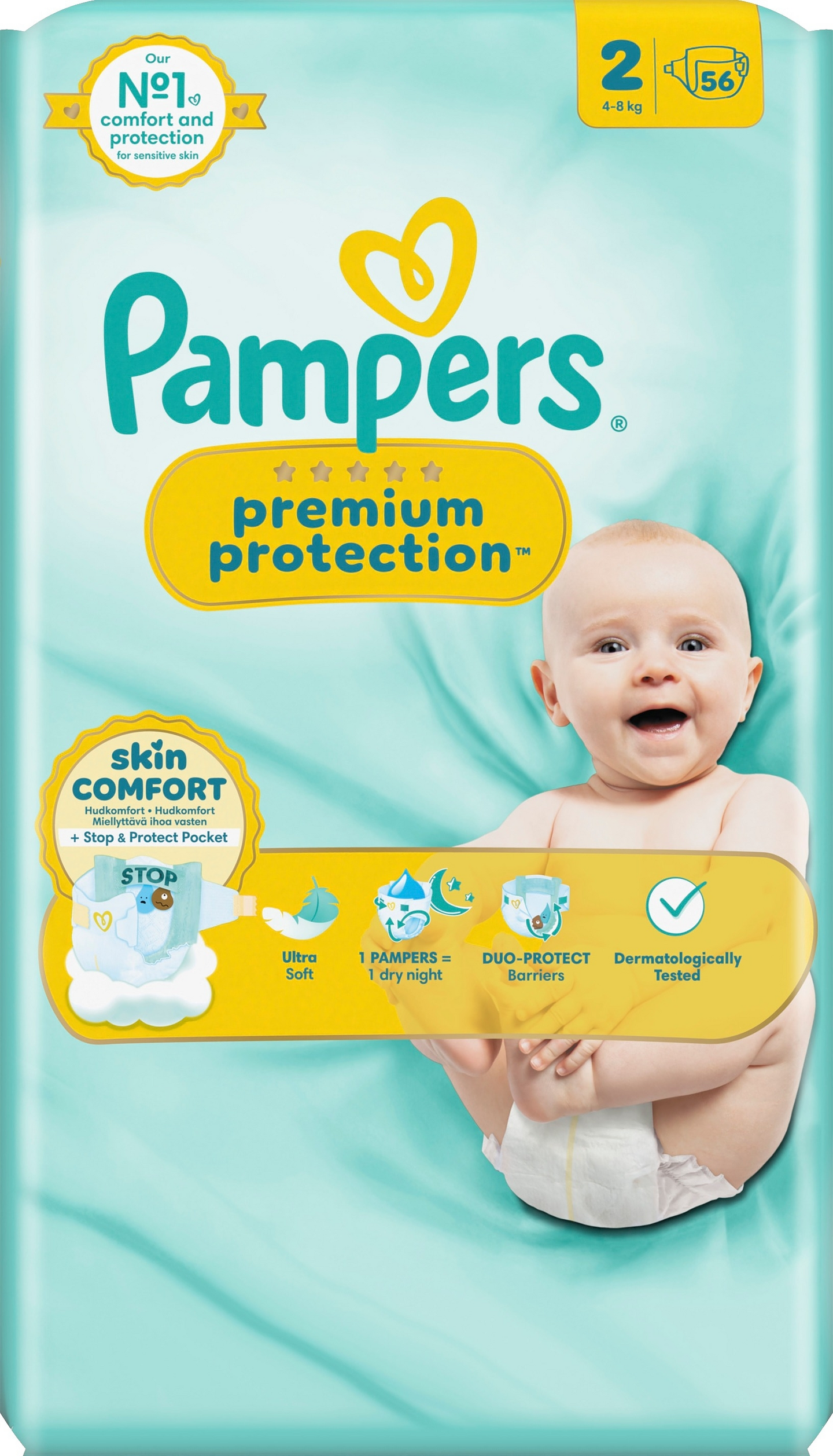 KAKSINKERTAINEN SUOJA: suojaa ihoa ja suojaa ohivuodoilta. Pampersin parasta mukavuutta ja suojaa herkälle iholle – vauvojen testaama ja hyväksymä! Olemme kehittäneet Pampersin parhaimman vaipan erityisesti vastasyntyneen herkälle iholle. Ja se on paras vaippamme myös vuotoja vastaan. Pampers Premium Protection -vaipat antavat Pampersin parhaimman suojan 1) VÄLITÖN IMEYTYMINEN – tuhannet imukykyiset mikrohuokoset imevät kosteuden ja kakan välittömästi iholta ja pitävät ihon kuivana ja suojattuna. 2) AINUTLAATUINEN STOP & PROTECT -TASKU vaipan takaosassa estää sotkuiset vuodot. 3) SUOJAAVAT JA ÄÄRIMMÄISEN PEHMEÄT MATERIAALIT tuntuvat mukavilta ja suojaavat vauvan ihoa. 4) Ainutlaatuinen COMFORT FIT -istuvuus limittäisellä kiinnitysjärjestelmällä ja napaystävällisellä muodolla. Pampers Premium Protection -vaipat ovat 100 % turvallisia vauvasi iholle: ne ovat dermatologisesti testattuja ja Skin Health Alliancen ihotautilääkäreiden hyväksymiä. Ei ihme, että vastasyntyneet pitävät niistä!