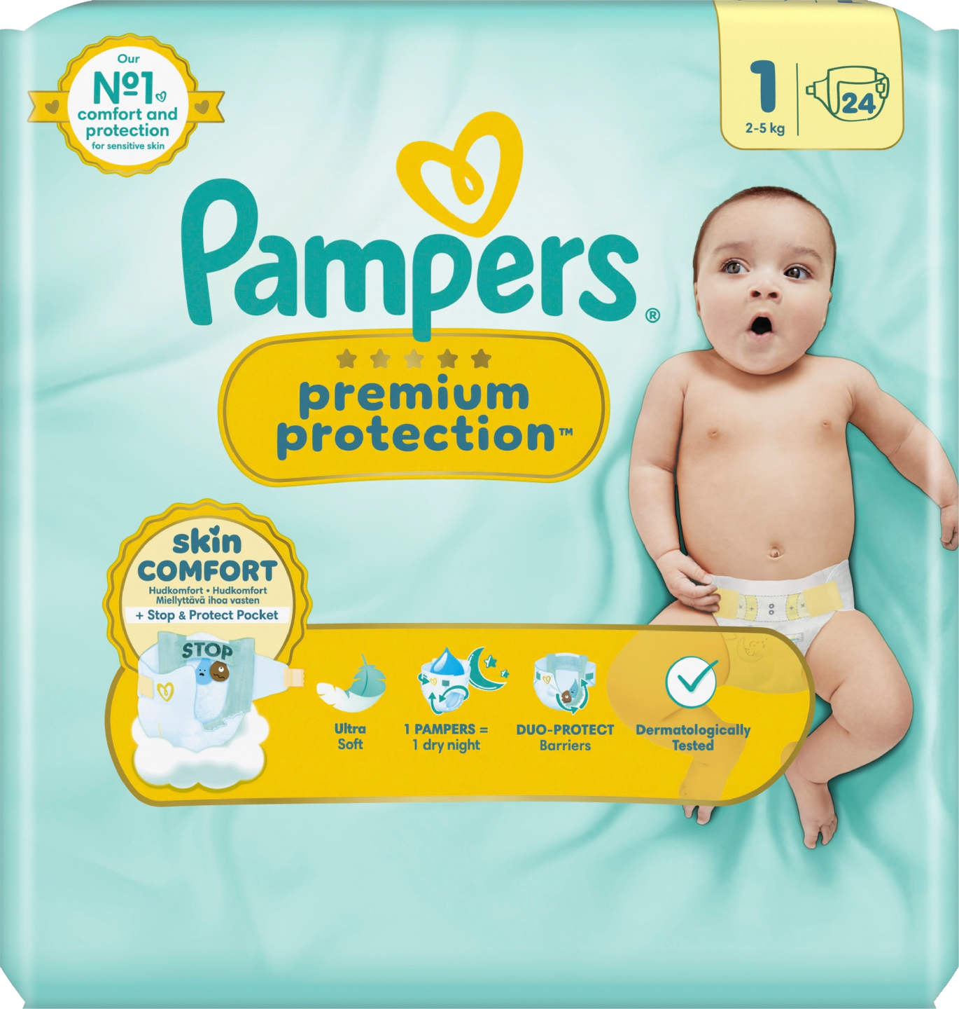 KAKSINKERTAINEN SUOJA: suojaa ihoa ja suojaa ohivuodoilta. Pampersin parasta mukavuutta ja suojaa herkälle iholle – vauvojen testaama ja hyväksymä! Olemme kehittäneet Pampersin parhaimman vaipan erityisesti vastasyntyneen herkälle iholle. Ja se on paras vaippamme myös vuotoja vastaan. Pampers Premium Protection -vaipat antavat Pampersin parhaimman suojan 1) VÄLITÖN IMEYTYMINEN – tuhannet imukykyiset mikrohuokoset imevät kosteuden ja kakan välittömästi iholta ja pitävät ihon kuivana ja suojattuna. 2) AINUTLAATUINEN STOP & PROTECT -TASKU vaipan takaosassa estää sotkuiset vuodot. 3) SUOJAAVAT JA ÄÄRIMMÄISEN PEHMEÄT MATERIAALIT tuntuvat mukavilta ja suojaavat vauvan ihoa. 4) Ainutlaatuinen COMFORT FIT -istuvuus limittäisellä kiinnitysjärjestelmällä ja napaystävällisellä muodolla. Pampers Premium Protection -vaipat ovat 100 % turvallisia vauvasi iholle: ne ovat dermatologisesti testattuja ja Skin Health Alliancen ihotautilääkäreiden hyväksymiä. Ei ihme, että vastasyntyneet pitävät niistä!