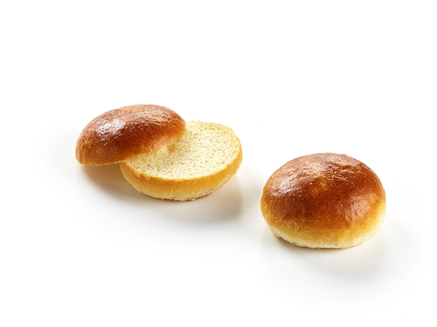 Pyöreä ja keskikoikoinen pehmeä sämpylä on leivottu brioche-taikinaan. Tuote on valmiiksi halkaistu.