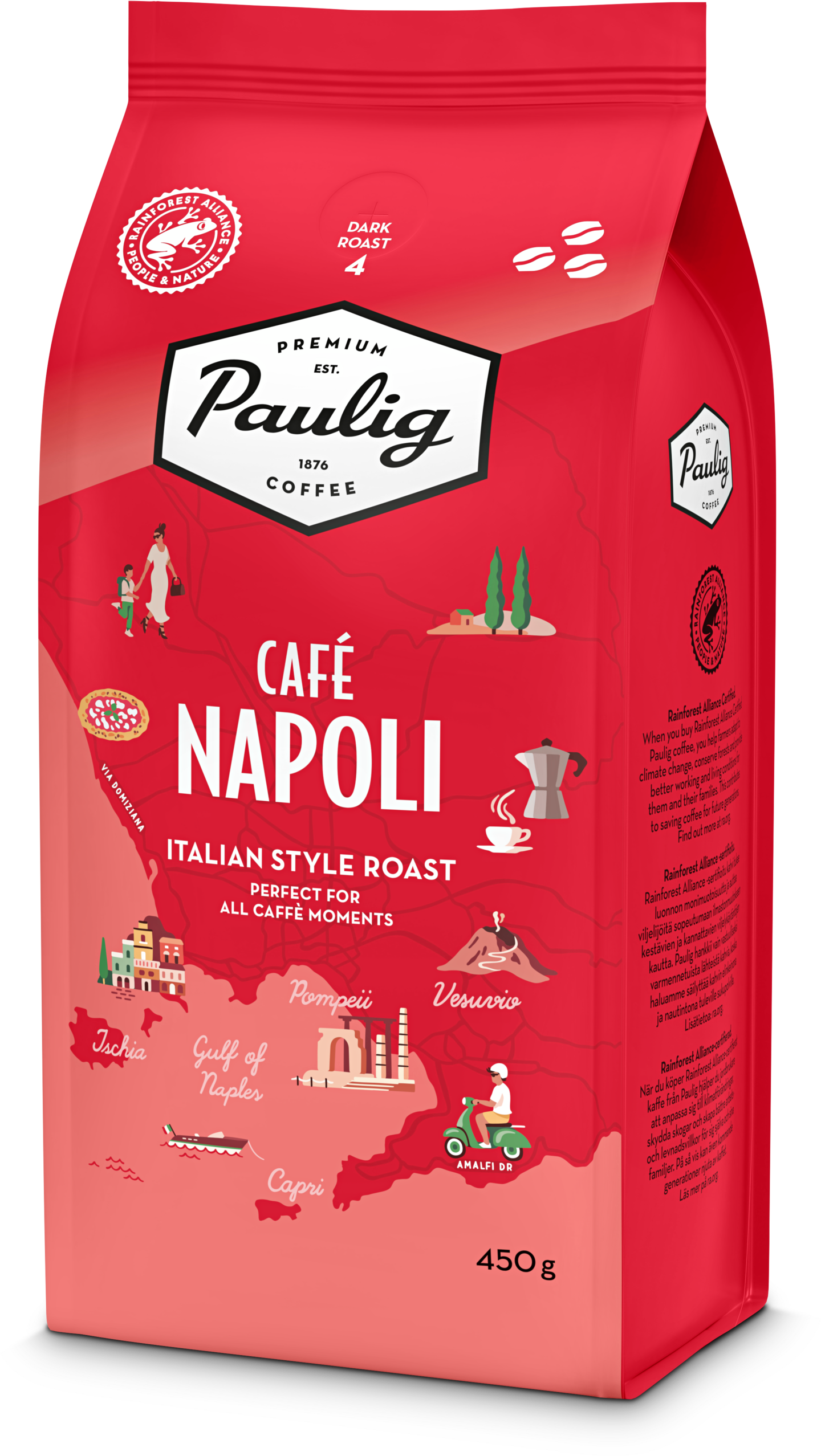 Paulig Café Napoli on italialaiseen tyyliin tummapaahtoinen ja pehmeä papukahvi, joka on inspiroitunut tunnelmallisten kujien pizzerioista ja niiden espressoa nauttivista vieraista. Kahvipapujen mausta voit löytää rotevaa paahteisuutta ja tumman sokerin vivahteita. Nauti kuppi Napolia voimakkaana espressona, pehmeänä cappuccinona tai espressotyylisenä juomana mutteripannulla valmistettuna kuten Napolissa on tapana. Paahtoaste 4.
