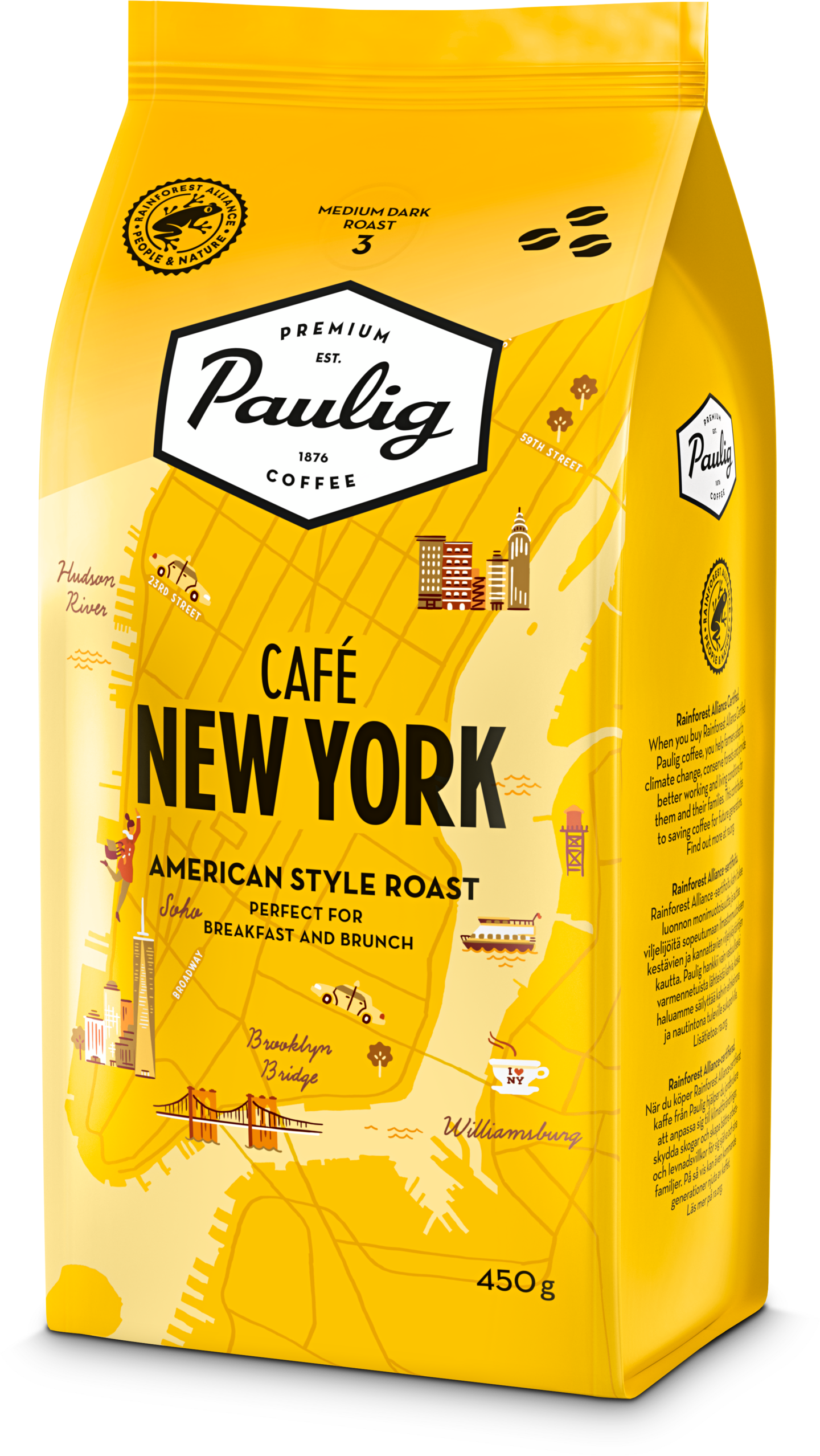 Paulig Café New York on keskitumma papukahvi hedelmäisillä vivahteilla. Paulig Café New York papukahvi on Pauligin kaupunkikahvi, joka on saanut inspiraationsa suurkaupungin sykkeestä ja New Yorkin rikkaasta kaupunkikulttuurista. Papukahvin vivahteikas maku on peräisin Latinalaisen Amerikan arabica-pavuista ja makeutta keskitummaan kahviin tuovat brasilialaiset kahvipavut. Paulig Café New York kahvipapujen hedelmäinen maku sopii erinomaisesti aamupalalle, brunssille, pitkin päivää juotavaksi tai päiväkahviksi leivonnaisten kanssa nautittavaksi. Paulig Café New York kahvipavut sopivat mainiosti myös Yhdysvalloista lähtöisin olevan kylmän Cold Brew -kahvin valmistamiseen. Paahtoaste 3.