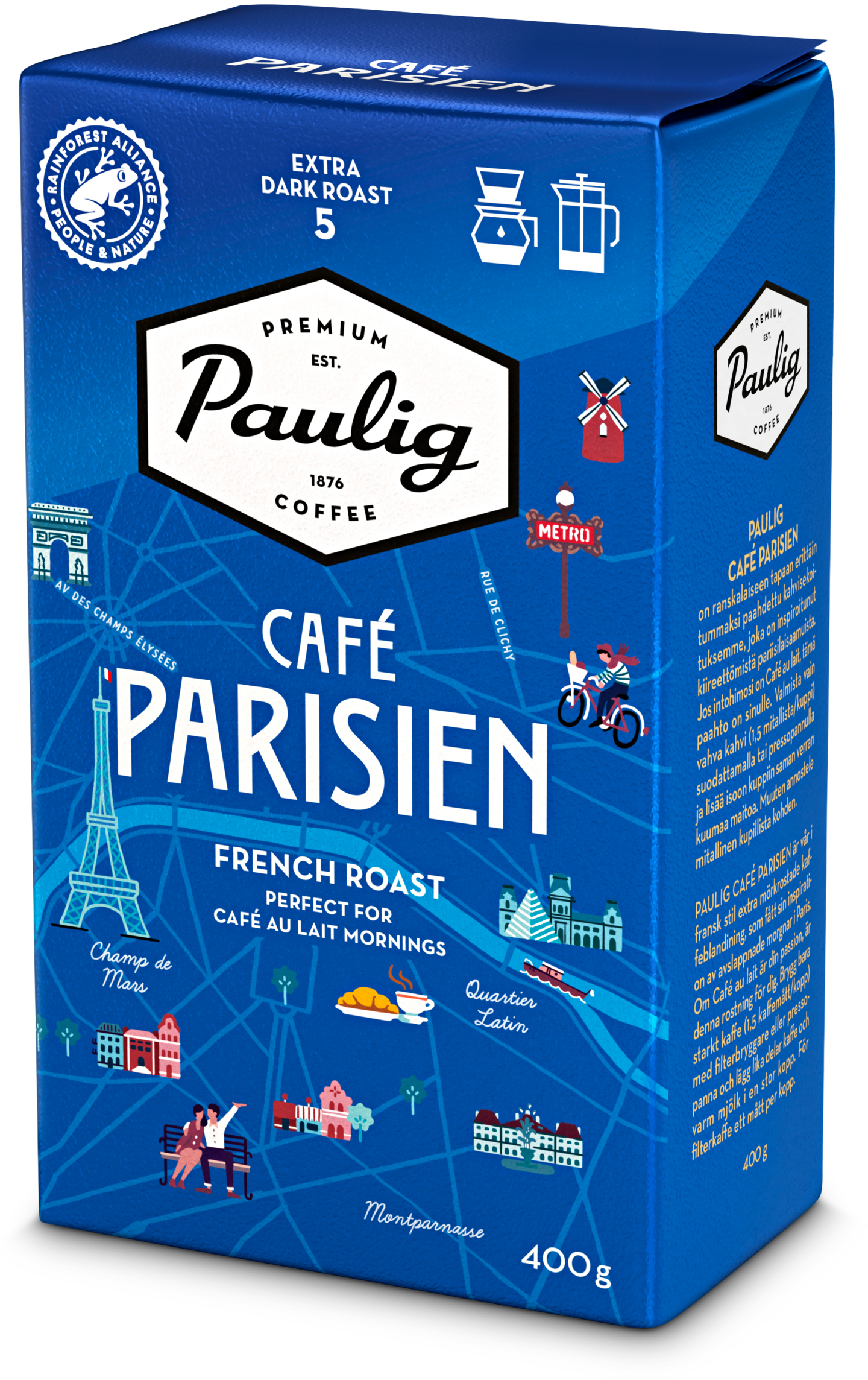Paulig Café Parisien on erittäin tumma ranskalaistyyppinen suodatinkahvi suklaisilla vivahteilla. Pauligin Kaupunkikahvien sarjaan kuuluva Paulig Café Parisien kahvi on saanut inspiraationsa pariisilaisesta kahvikulttuurista ja ranskalaiseen tapaan Café Parisien on paahdettu erittäin tummaksi. Paulig Café Parisien kahvi sopii erinomaisesti kiireettömien aamujen Café au lait -maitokahviksi. Tummapaahtoisen kahvin ystävät pitävät siitä myös sellaisenaan suodatinmenetelmällä tai pressopannulla valmistettuna. Paulig Café Parisien hienojauhettu kahvi sopii makupariksi erityisesti suolaisille leivonnaisille, kuten croissantille, sekä vähemmän makeille leivonnaisille. Kahvisekoituksessa on Rainforest Alliance -sertifioituja kahvipapuja Etelä- ja Keski-Amerikan lisäksi Afrikasta ja Intiasta. Afrikkalaiset kahvipavut tuovat Paulig Cafe Parisien kahviin marjaisuutta, ja pieni siivu intialaista robustaa tasapainoittaa kahvin makua. Paahtoaste 5.