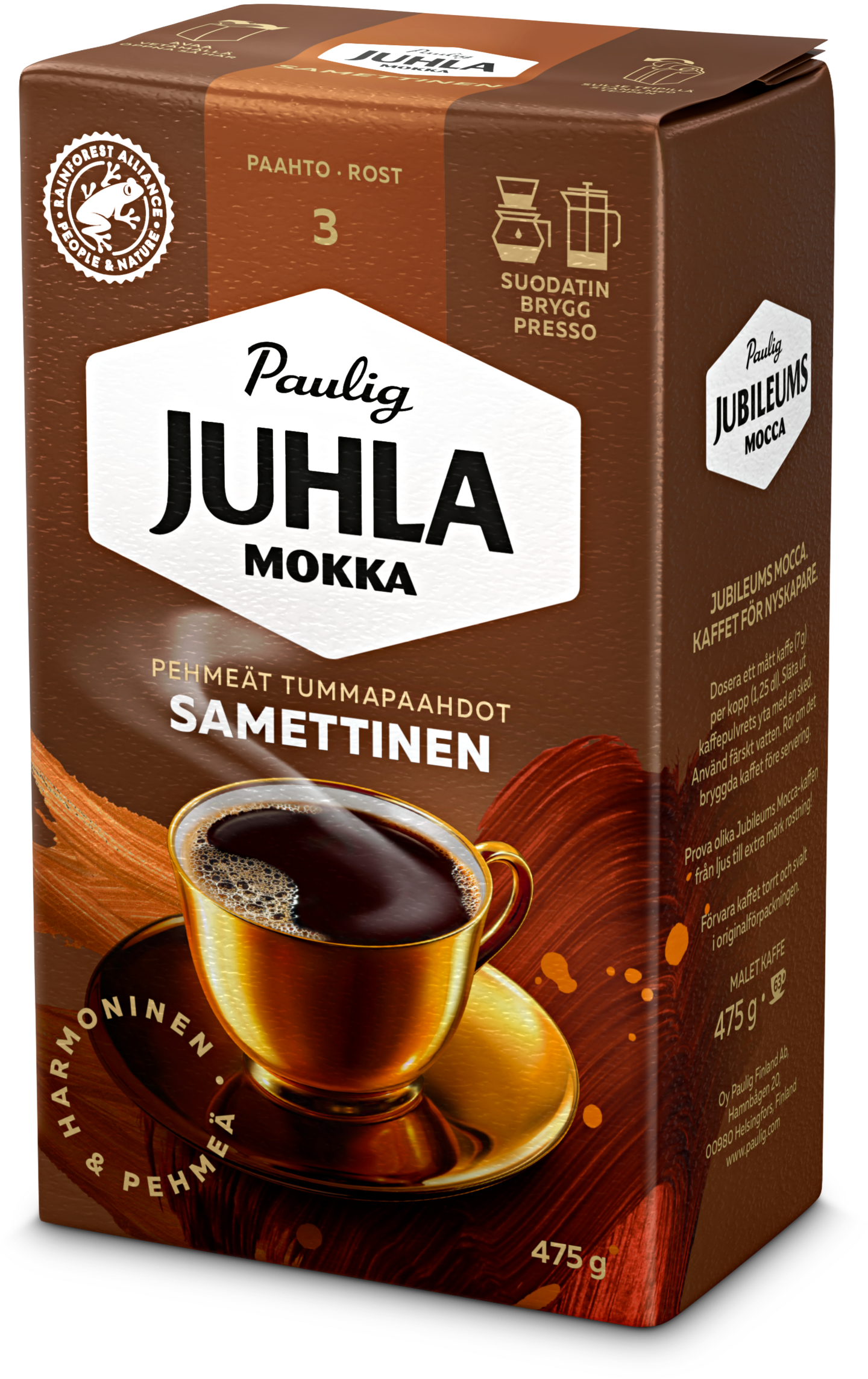 Juhla Mokka Samettinen on hurmaava, tummapaahtoinen kahvisekoitus pehmeän maitosuklaisilla vivahteilla. Kahvin harmoninen makumaailma on peräisin Etelä- ja Väli-Amerikan parhaista Rainforest Alliance -sertifioiduista 100 % arabica-kahvilaaduista. Harmoninen ja pehmeä. Paahtoaste 3.