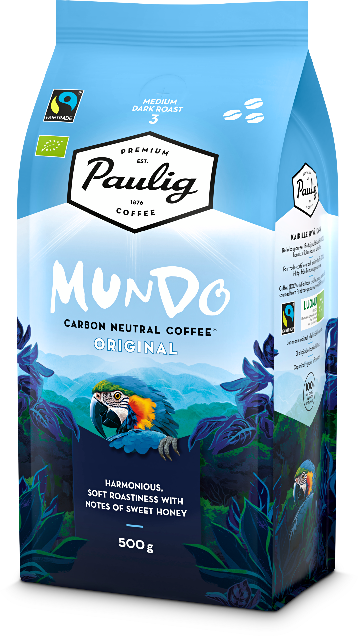 Paulig Mundo Original on suomalaiseen makuun kehitetty korkealaatuinen, Reilun Kaupan vastuullisuussertifioitu luomu suodatinkahvi. Kahvin raikkaassa, paahteisessa ja hunajaisessa maussa on vivahteena myös tummaa sokeria. Paulig Mundo on helppo yhdistää kaikenlaisten tarjoiltavien kanssa ja se sopii makupariksi monenlaisille leivonnaisille. Kokeile esimerkiksi Runebergintortun, berliininmunkin tai suolaisen ruisleivän ja suolaisten juustosarvien kanssa. Keskitummapaahto, paahtoaste 3.