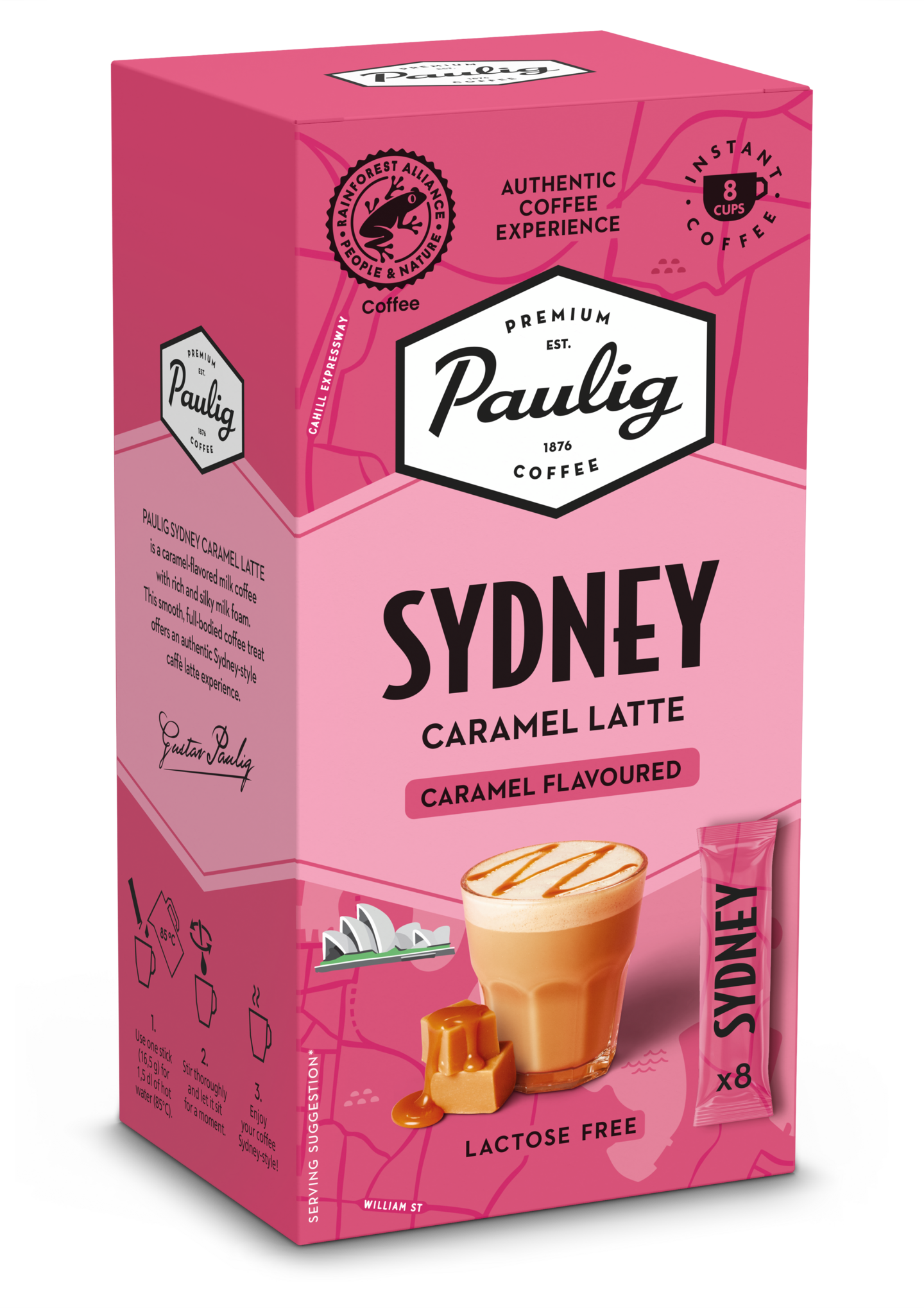 LaktoositonPAULIG SYDNEY CARAMEL LATTE on karamellinmakuinen maitokahvi täyteläisen silkkisellä maitovaahdolla. Pehmeä ja täyteläinen kahviherkku tarjoaa aidon caffè latte -kokemuksen