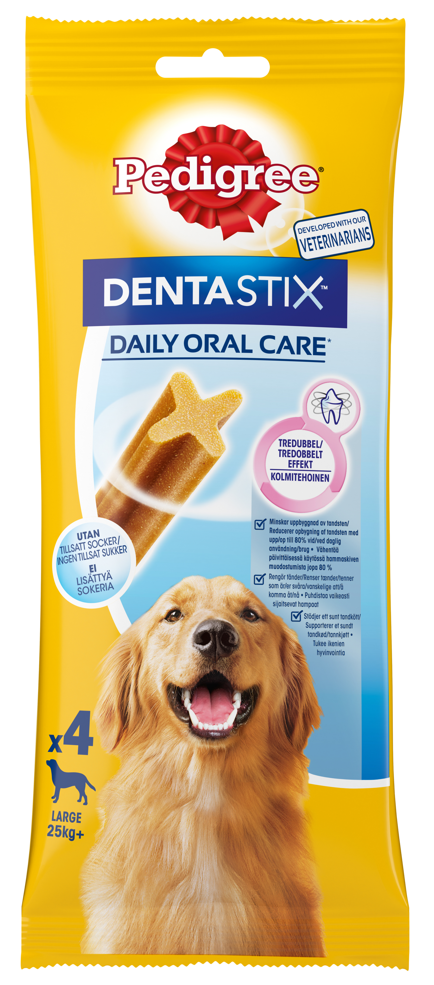 Neljällä viidestä yli 3-vuotiaasta koirasta on iensairaus, joka johtuu hammaskiven ja plakin muodostumisesta. PEDIGREE ® DENTASTIX™ Daily Oral Care -purupalojen TRIPLE ACTION vaikutuksen on tieteellisesti todistettu vähentävän päivittäisessä käytössä hammaskiven muodostumista jopa 80%, puhdistavan vaikeasti sijaitsevia hampaita ja tukevan ikenien hyvinvointia. ✔ Ainutlaatuinen x-muoto ✔ Vähärasvainen ✔ Ei keinotekoisia värejä ja aromeja