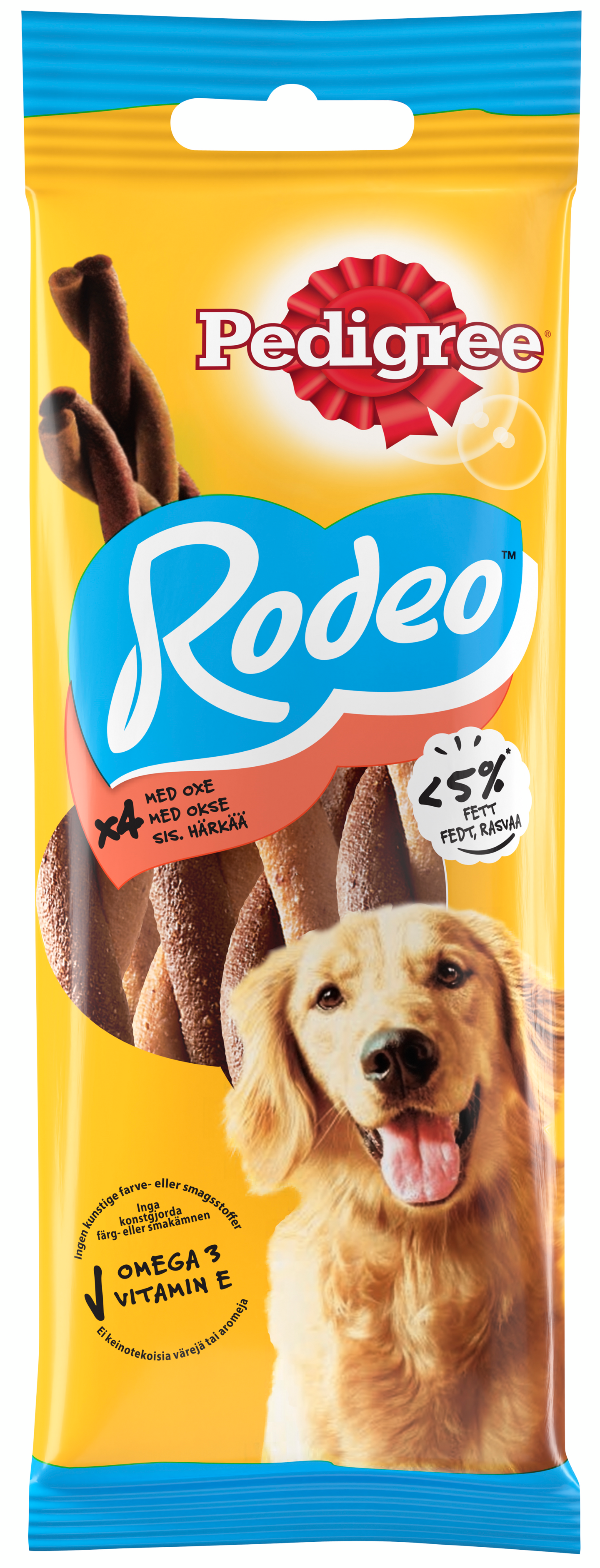 Pedigree® Rodeo® -makupalat soveltuvat loistavasti niin koiran palkitsemiseen kuin kiintymyksen osoittamiseen. Niiden ainutlaatuinen kierteinen muoto, vastustamattoman lihaisan maku ja mukava purutuntuma tuottavat koiralle pitkään kestävää nautintoa. Koirista on mukava etsiä. Kierteiset Rodeo™-purutikut maistuvat koirille. Ne ovat oikea valinta päivittäiseen hemmotteluun. Niiden ainutlaatuinen kierremuoto tekee rakenteesta mieluisan. Niitä voi nauttia leikittäessä ja hetkinä, jolloin kiintymyssuhde vahvistuu.