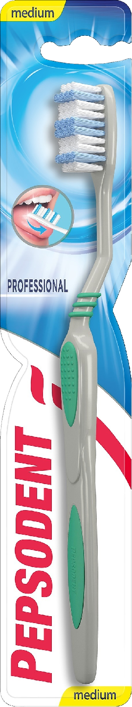 Hampaiden tehokas ja perusteellinen puhdistus onnistuu Pepsodent Professional hammasharjalla. Anatomisesti muotoillun hammasharjan harjapäässä olevat harjakset ovat erikorkuisia, jotta ne ulottuvat helpommin vaikeapääsyisiin hammasväleihin. Harjan kolmikulmainen varsi helpottaa ulottumista kaikkialle suuhun: harja pesee myös takahampaat tehokkaasti. Pepsodent Professional on hammasharja, jonka jokainen perheenjäsen voi valita omaksi harjakseen. Hammasharjasta on saatavana keskikovan harjaspään (Medium) lisäksi kaksi muuta versiota. Valitse harjasi hampaiden ja ikenien herkkyydestä riippuen: erittäin pehmeä (Extra Soft), pehmeä (Soft) tai keskikova (Medium).