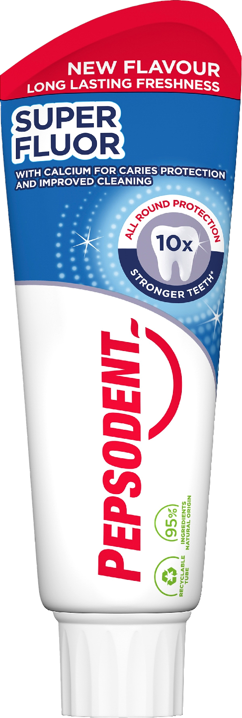 Pepsodent Super Fluor on raikas ja miedonmakuinen hammastahna koko perheelle. Pepsodent Super Fluor -hammastahna vähentää happohyökkäyksen hampaiden kiillettä liuottavaa vaikutusta ja ehkäisee kariesta. Pepsodent Super Fluor raikastaa suun samalla kun hampaat puhdistuvat perusteellisesti: tuloksena on raikas hengitys koko perheelle ja vähemmän reikiä hampaissa. Pepsodent Super Fluor vahvistaa hampaidesi kiillettä ja sisältää suositellun määrän fluoria, 1450 ppm. Parhaan tuloksen saavuttamiseksi, annostele kaksi grammaa hammastahnaa (n. 2 cm pituinen nokare) harjalle. Älä huuhtele suuta pesun jälkeen. Jokainen hymy on tärkeä. Pepsodent on hammashoidon asiantuntija, jonka valikoimasta löydät tuotteet koko perheelle. Pepsodentillä on pitkä kokemus hampaiden terveyden edistämisestä ja se on vuosien aikana kerännyt runsaasti tietoa, mikä auttaa parantamaan suun terveyttä kaikissa elämänvaiheissa. Haluamme että sinun suusi voi hyvin ja että voit tehdä varmoja suun terveyttä edistäviä valintoja sekä itsellesi että perheellesi. Siksi tarjoamme erinomaisen kestävän suojan hampaillesi vastuullisesti. Pyrimme levittämään oikeita käytäntöjä parhaaseen hampaiden hoitoon, sillä ennaltaehkäisy on avain terveeseen ja iloiseen suuhun. Koska meille jokainen hymy on tärkeä, mikään saa olla hymyn tiellä. Siksi olemme useiden vuosien ajan keskittyneet aktiivisesti suun terveyden parantamiseen yhdessä sairaanhoitajien, opettajien ja vapaaehtoisten kanssa. Pepsodentin suunhoitoaktiviteetteihin kuuluu kouluille tarkoitettuja ohjelmia, ilmaisia hammastarkastuksia ja yhteisöavustusohjelmia, jotka tavoittavat yli viisi miljoonaa ihmistä vuosittain ympäri maailmaa. Opetamme koululaisia huolehtimaan suun terveydestä oikein. Annamme vinkkejä hyvään hampaiden harjaukseen. Kerromme oikeanlaisesta suun hoidosta hauskalla, vakuuttavalla ja interaktiivisella tavalla. Ohjelmamme kannustavat pitkäaikaisiin harjaustottumuksiin. Tavoitteena on saavuttaa mitattavia parannuksia sekä lasten että aikuisten suun terveydessä kaikkialla maailmassa. Pepsodent on tehnyt töitä parempien harjaustottumusten levittämiseksi yli 25 vuoden ajan.