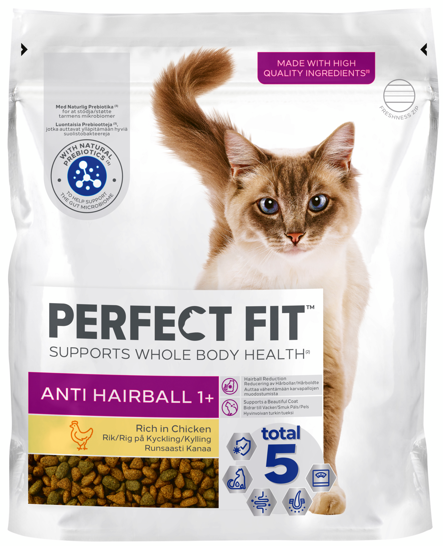 Ainutlaatuisen Perfect Fit™ Total 5 koostumuksen lisäksi, Anti Hairball 1+ auttaa vähentämään karvapallojen muodostumista. Sisältää luontaisia kuituja, jotka ehkäisevät karvapallojen muodostumista ja auttavat karvojen kulkeutumisessa läpi ruoansulatuskanavan.