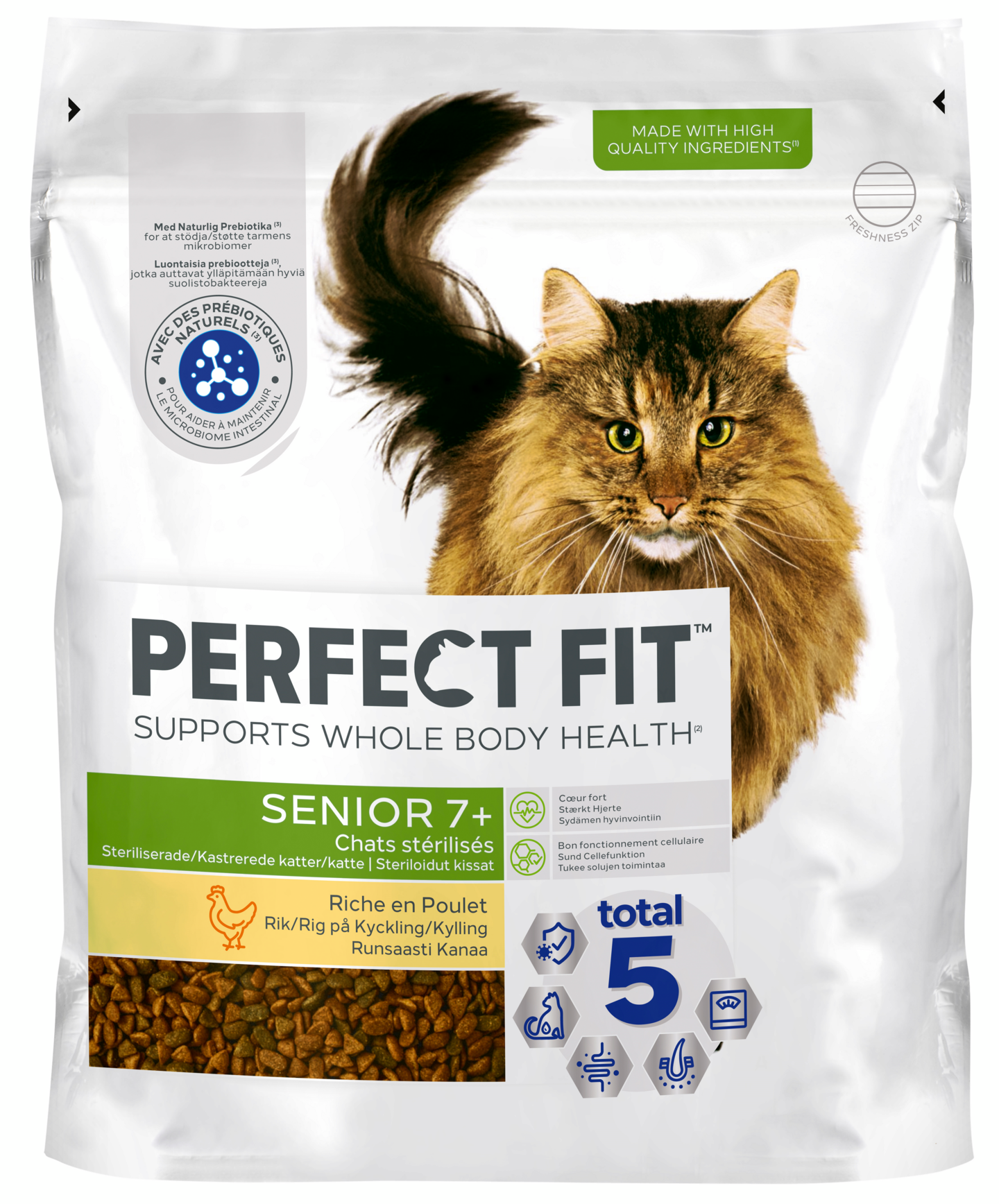 Ainutlaatuisen PERFECT FIT™ Total 5 -koostumuksen lisäksi Senior 7+ tuo tullessaan kolme täydentävää etua seniorikissojen erityistarpeisiin: