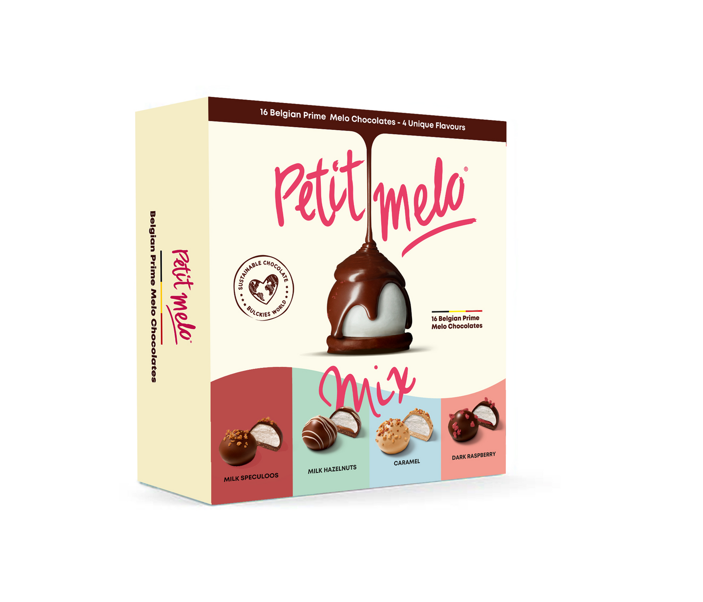 Nämä pienet herkut on valmistettu herkullisista ja laadukkaista raaka-aineista. Sisällä on keksimurupohjan päällä ilmavaa vaahtoa, joka on peitetty kahdella rapealla kerroksella belgialaista suklaata. Rasiassa neljä makua: speculoos, hasselpähkinä, karamelli ja vadelma.