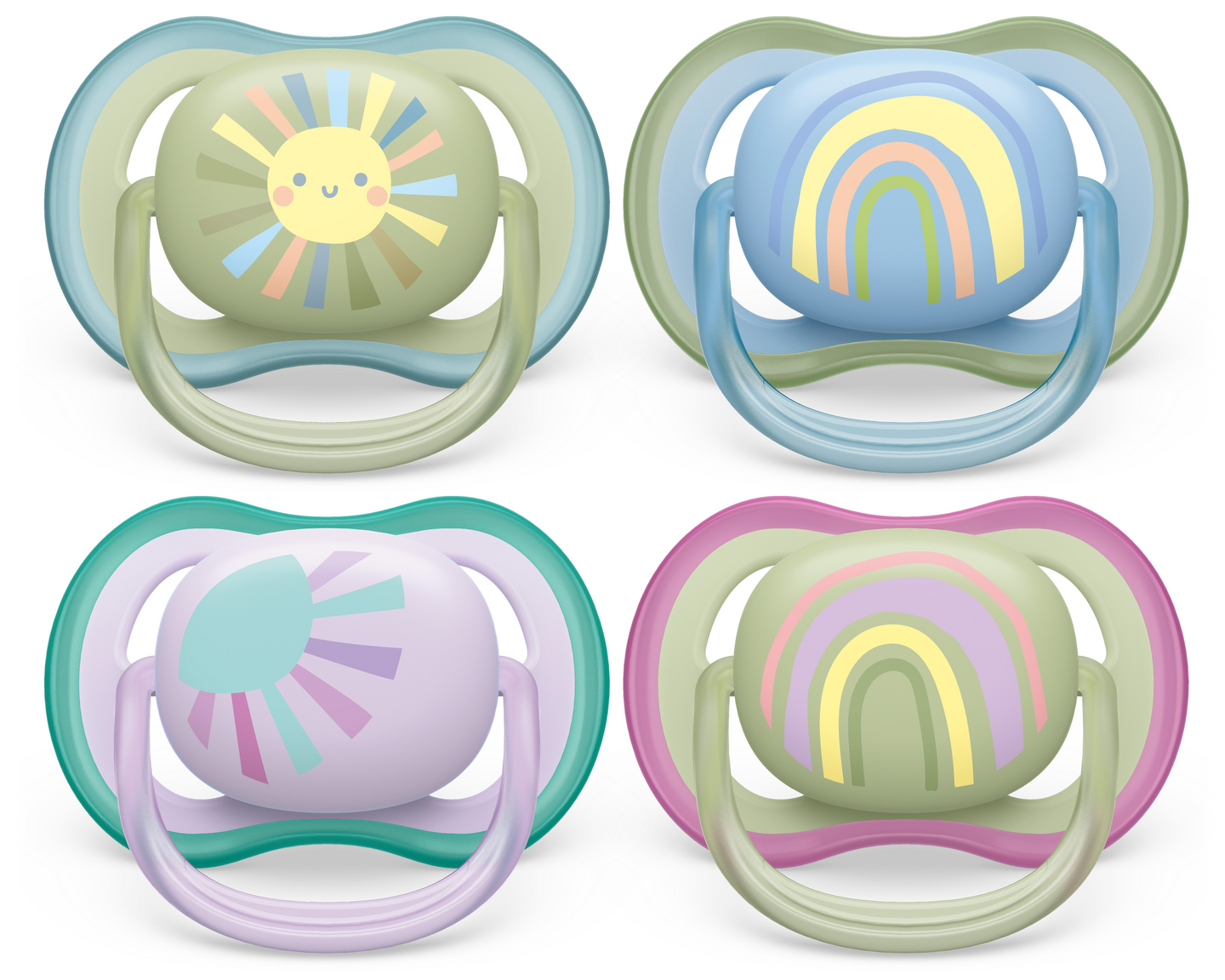 Rauhoittava, tehokas ilmankulku. Philips Avent ultra air -tutin erityisen suuret ilma-aukot pitävät vauvan ihon kuivana. Saatavilla eri väreissä ja tyyleissä.