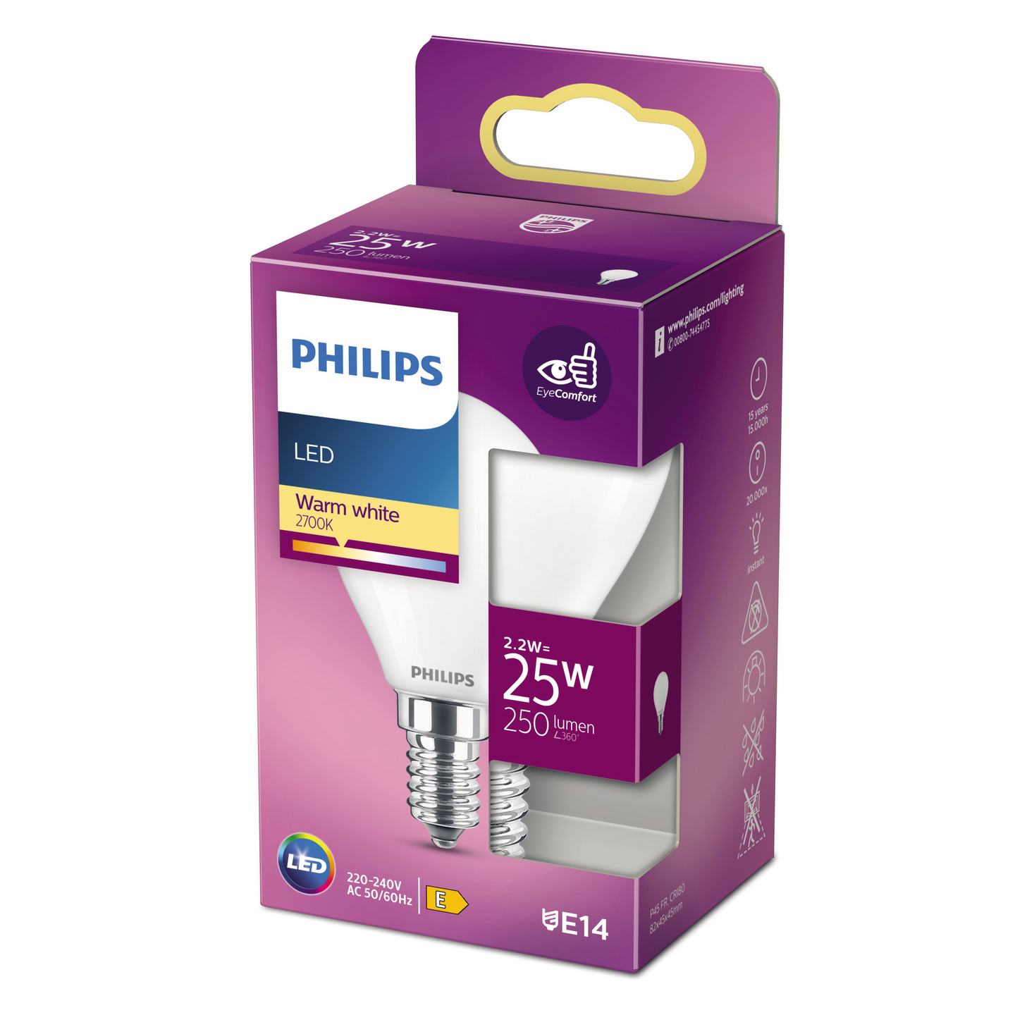 Philips LED -mainoslamppu on pyöreä ja kompakti, minkä ansiosta se sopii pienempiinkin valaisimiin. Lampun värilämpötila on 2700K (lämmin valkoinen) ja sen kanta on E14. Lampun LED-valo tuottaa silmillesi sopivaa valoa.