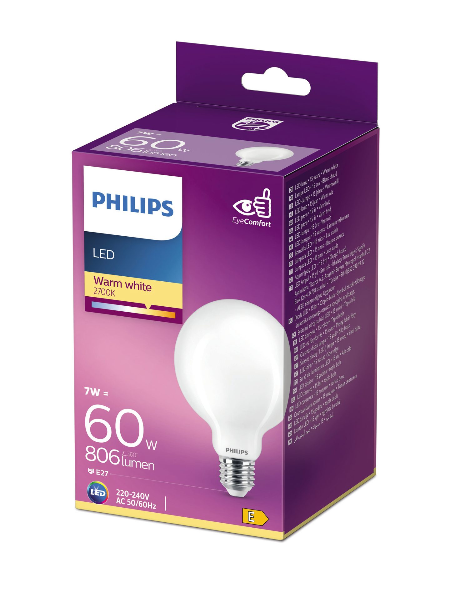 Pallon muotoisen Philips LED -lampun värilämpötila on 2700K (lämmin valkoinen). Lampun E27-kannan ansiosta se sopii moniin valaisimiin.