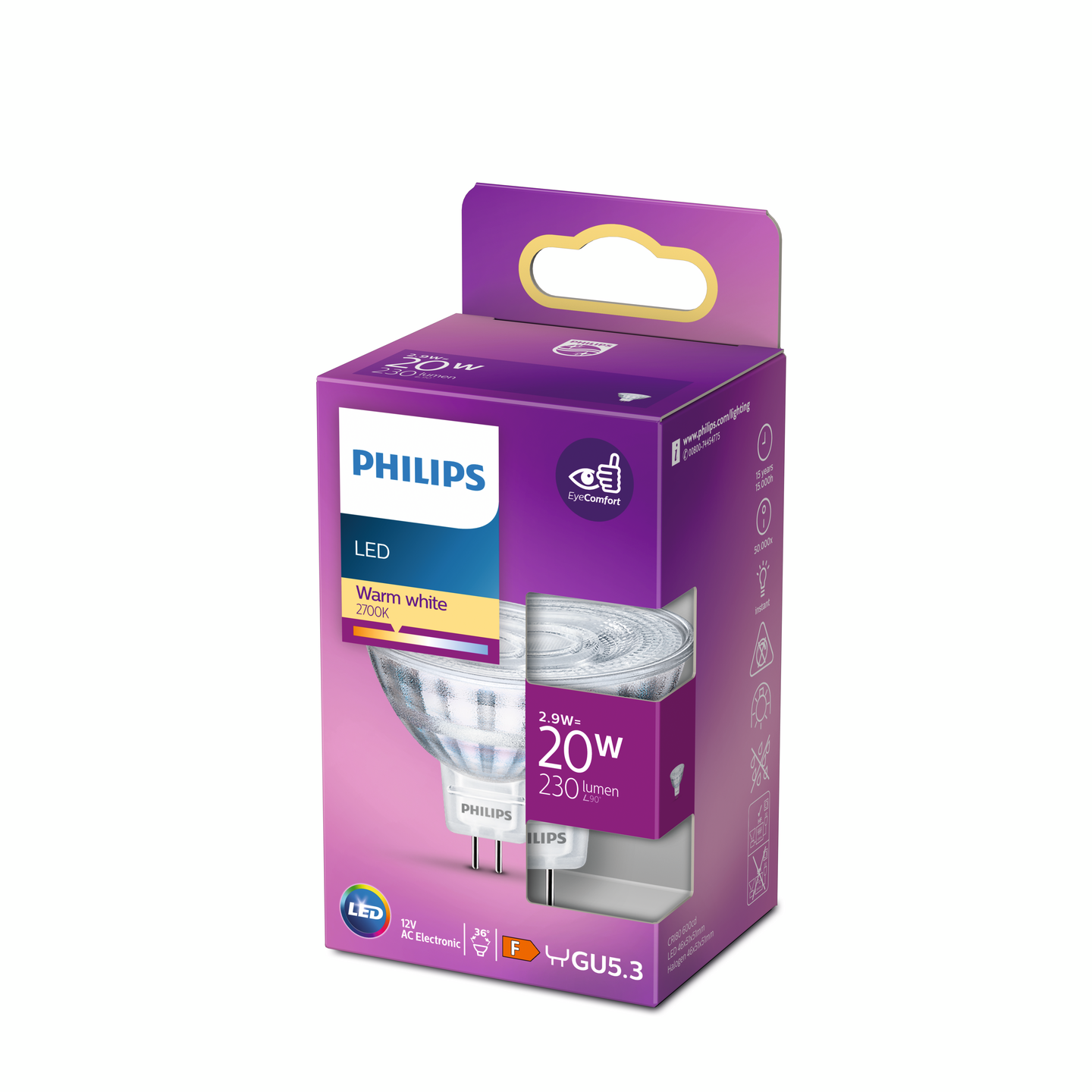 Philips LED -kohdelampun värilämpötila on 2700K (lämmin valkoinen), ja se tuottaa kotoisan lämminta valoa. Kohdelampun kanta on GU5.3 ja käyttöikä on jopa 15 000 tuntia. Lampun LED-valo tuottaa silmillesi sopivaa valoa.