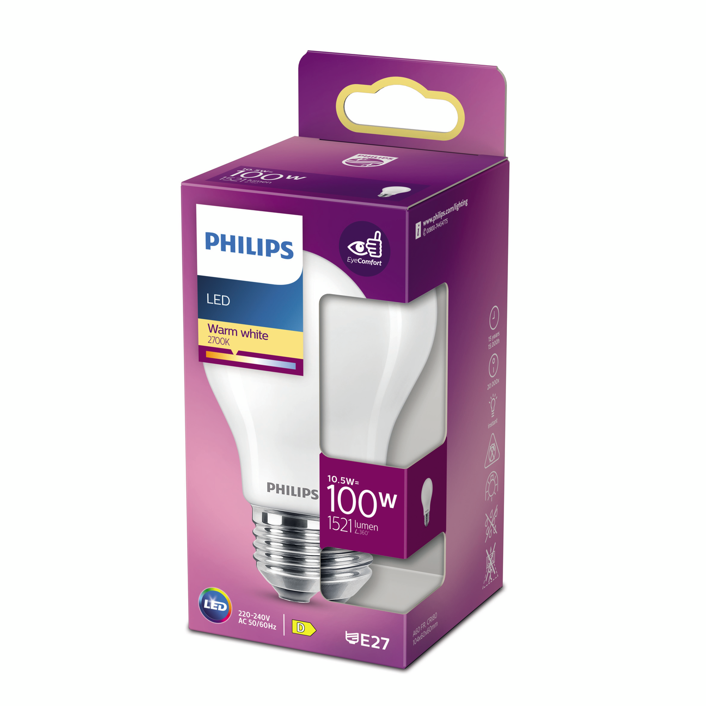 Philips LED -vakiolampun värilämpötila 2700K (lämmin valkoinen), se sopii useimpiin valaisimiin sen E27-kannan ansiosta ja sen käyttöikä on jopa 15 000 tuntia. Lampun LED-valo tuottaa silmillesi sopivaa valoa.