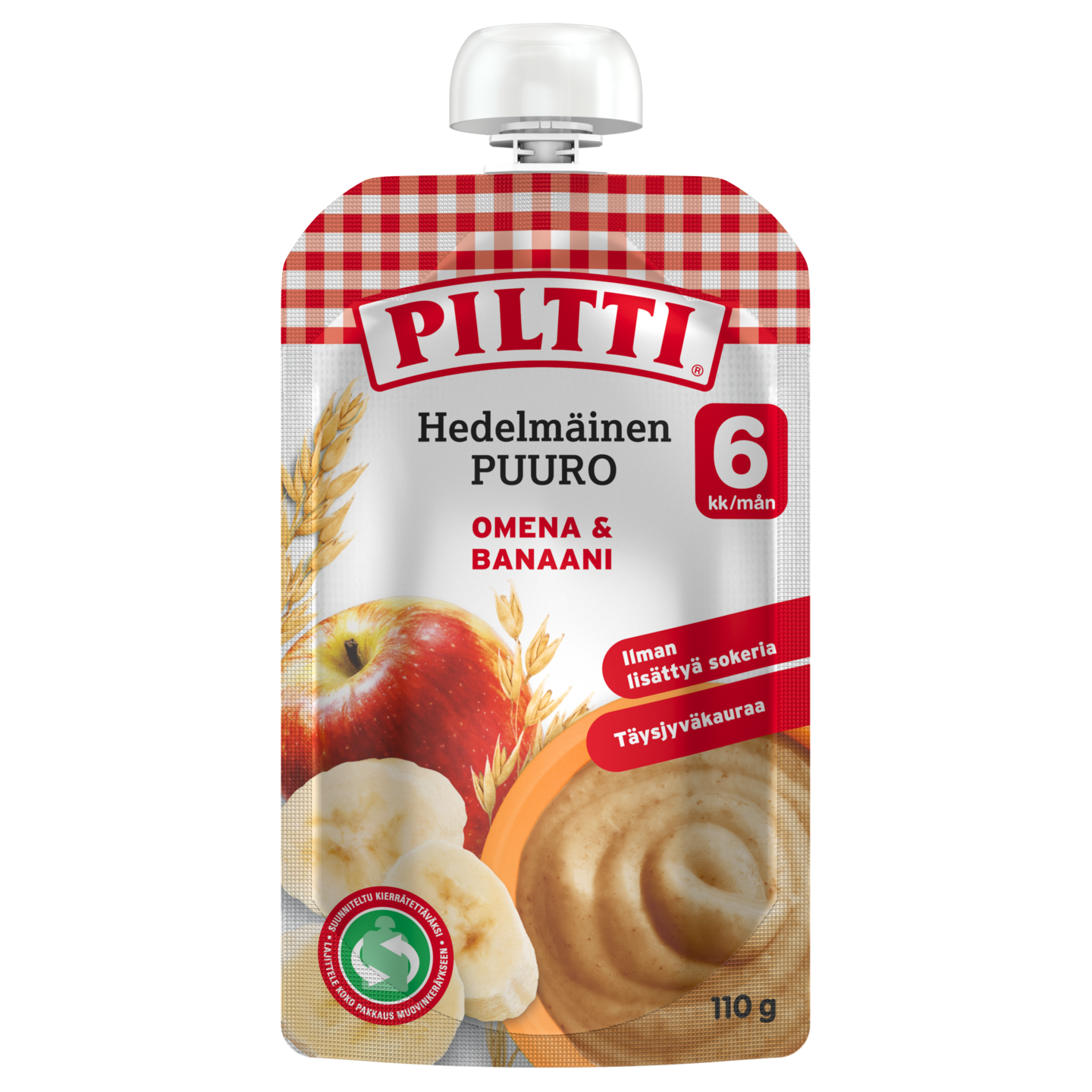 PILTTI Hedelmäinen puuro Omena & banaani 110g on ihanan pehmeä ja herkullinen välipala vauvalle 6kk iästä alkaen. Hedelmäinen puuro sisältää täysjyväkauraa ja herkullista omena- ja banaanisosetta.