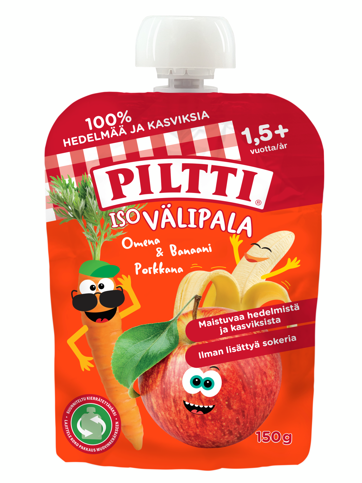 PILTTI Iso Välipala Omena-banaani-porkkana 150g on herkullinen yhdistelmä hedelmiä ja kasviksia. Tämä välipala ei sisällä lisättyä sokeria eikä makeita mehutiivisteitä, ja se soveltuu jälkiruoaksi ja välipalaksi lapselle 1,5v iästä alkaen.