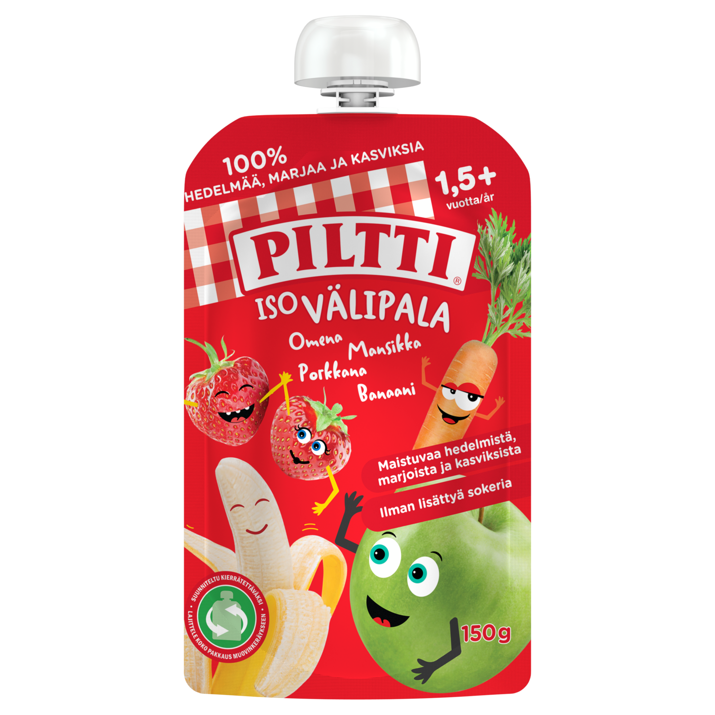 PILTTI Iso Välipala Omena-banaani-mansikka-porkkana 150g on maukas yhdistelmä hedelmiä ja kasviksia. Maistuvaa mansikkaa sisältävässä välipalassa ei ole lisättyä sokeria eikä makeita mehutiivisteitä, ja se soveltuu jälkiruoaksi ja välipalaksi lapselle 1,5v iästä alkaen.