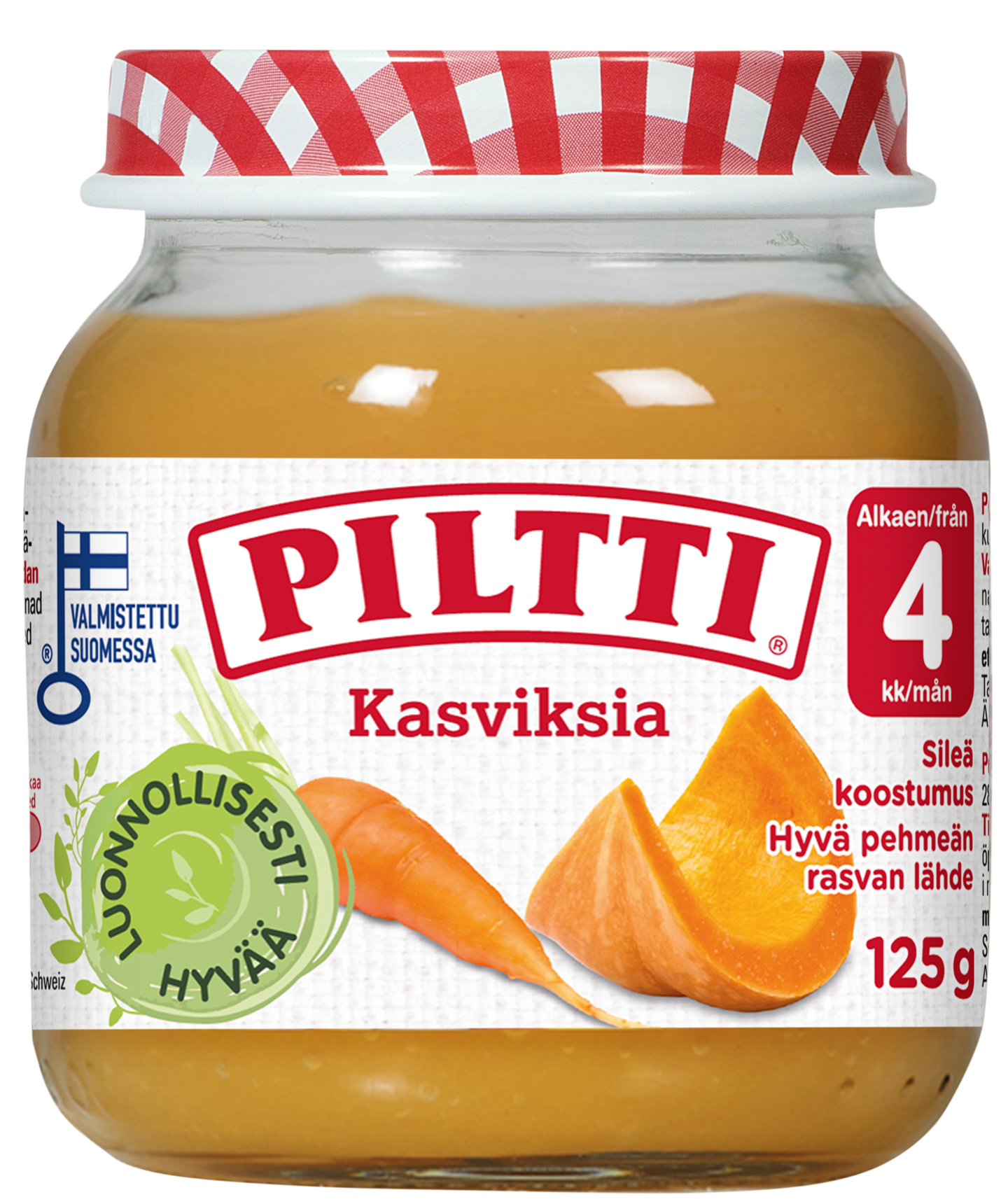 Piltti Kasviksia 4kk -reseptiin on koottu maistuva kahden kasvisraaka-aineen yhdistelmä: porkkana ja myskikurpitsa. Tuotteessa on myös mukana vauvallesi tärkeitä pehmeitä rasvoja rypsiöljystä. Näiden muutaman raaka-aineen johdosta sinun on myös helppo yhdistellä erilaisia makuja ja raaka-aineita toisten Piltti 4kk kasvisaterioiden kanssa, jolloin voit pikkuhiljaa monipuolistaa vauvasi aterioita ja makuelämyksiä. Ja vinkkinä, 4kk kasvissoseemme maistuvat myös vähän isommillekkin lisukkeina isompien aterioiden yhteydessä.