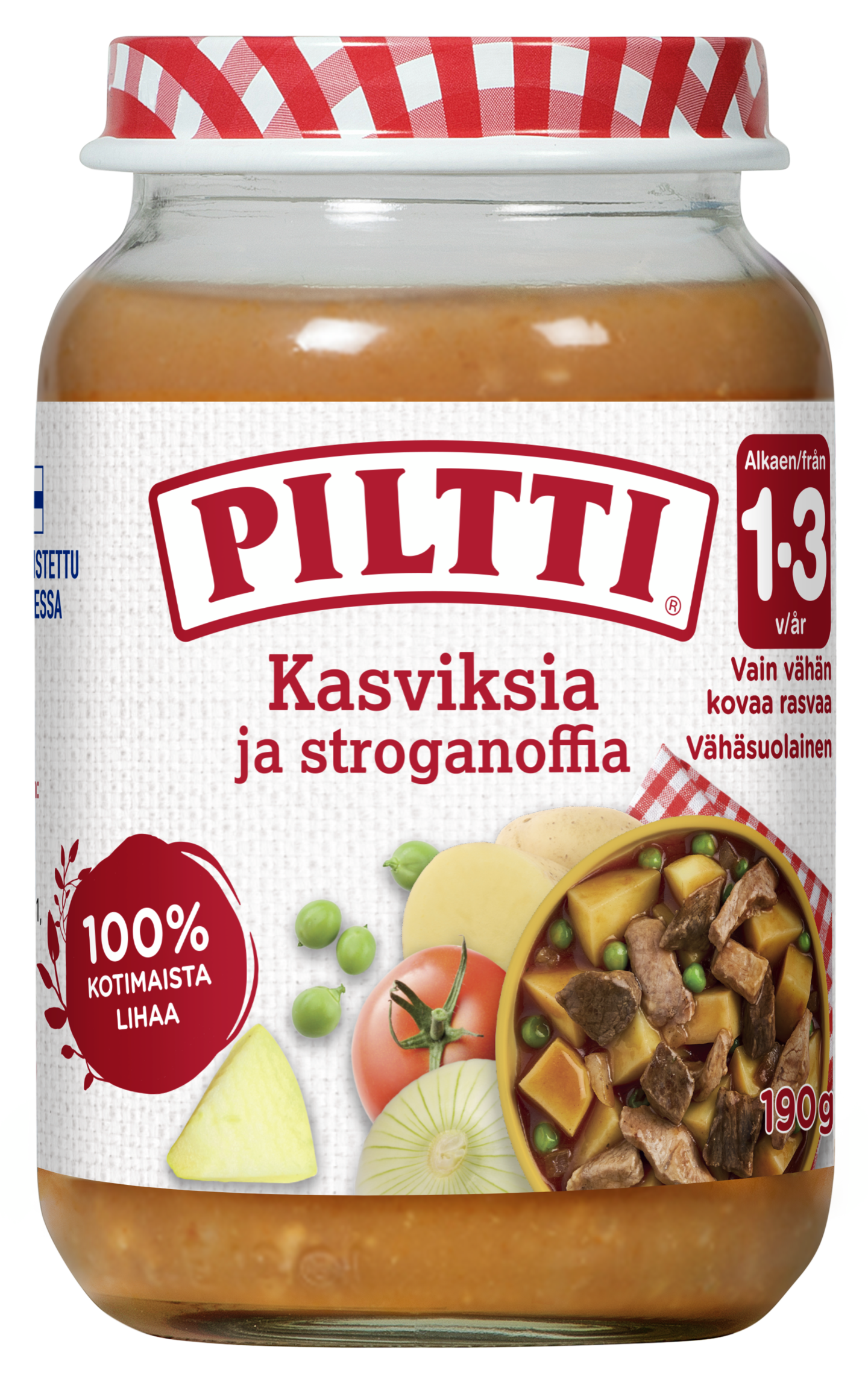 PILTTI Kasviksia ja stroganoffia on pienten lasten ateria perunasta, suomalaisesta sian- ja naudanlihasta, sipulista, omenasta ja herneistä. Lisää makua ateriaan tuo herkullinen tomaattisose. Tuotteessa on vain vähän kovaa rasvaa ja se on vähäsuolainen.