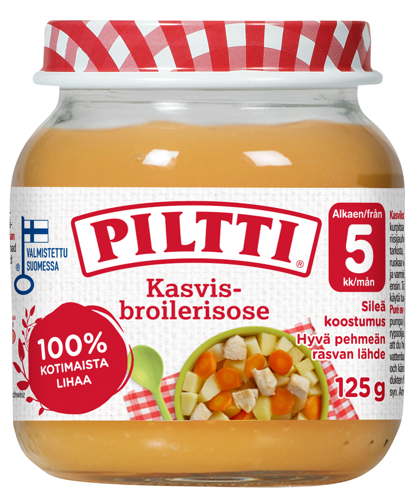 Piltti Kasvis-broilerisose 5kk on sileä ja pehmeä koostumukseltaan ja se on erityisesti suunniteltu erityisesti vauvasi ensiateriaksi. Maukkaan ja tasaisen koostumuksen avulla vauvan on helppo opetella suun motoriikan hallintaa pikkuhiljaa, sekä totuttautua erilaisiin makumaailmoihin. Reseptissä yhdistyy maistuvalla tavalla suomalainen kananliha sekä erilaiset kasvikset , ilman lisättyjä mausteita. Ihana maku ja väri tulevat vain raaka-aineista. Tässä tuotteessa käytämme suomalaista perunaa. Ateriassa on myös mukana vauvallesi tärkeitä pehmeitä rasvoja rypsiöljystä. Resepti on pidetty yksinkertaisena, jolloin voit helposti seurata vauvasi makumatkaa. Vinkkinä, vaihtelua saat lisäämällä Piltti 4 kk kasvisaterioita mukaan.