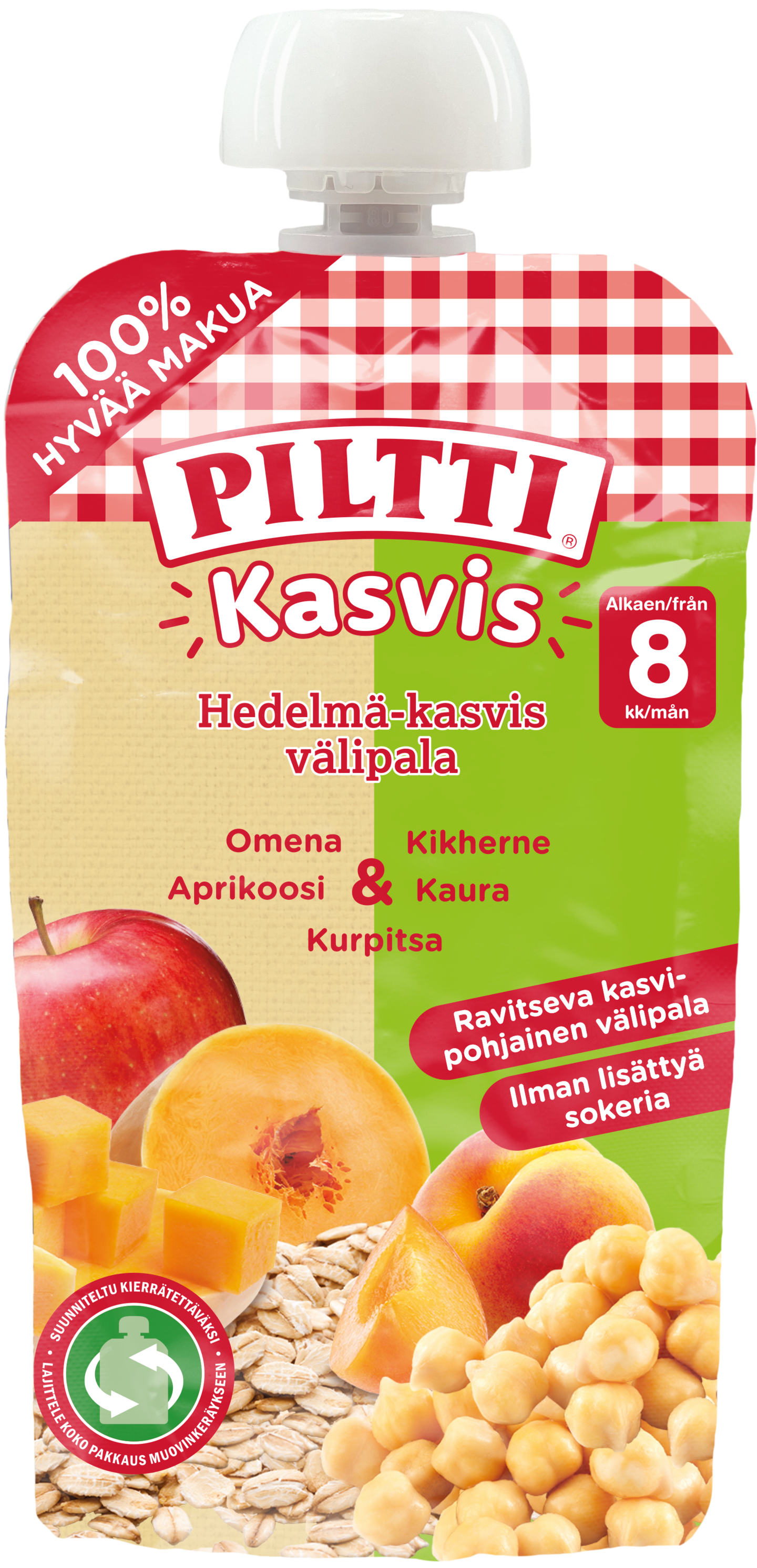 PILTTI Kasvis Hedelmä-kasvis välipala Omena-aprikoosi-kurpitsa-kaura-kikherne on ravitseva kasvipohjainen välipala vauvallesi 8 kk iästä alkaen. Hedelmiä, kasviksia, kikhernettä ja kauraa sisältävä välipala on helppo ja maistuva tapa lisätä kasviksia lapsesi ruokavalioon, ilman lisättyä sokeria. 100% hyvää makua!