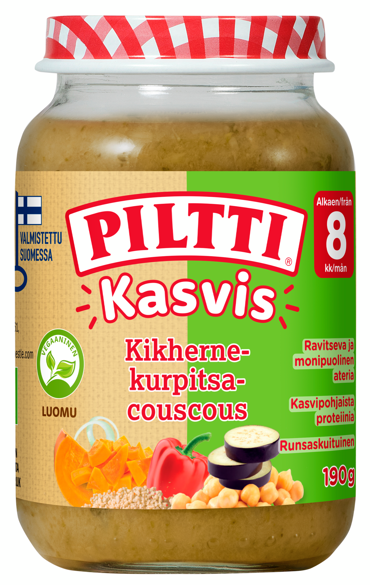 PILTTI Kasvis Kikherne-kurpitsa-couscous lastenruoka on maukas vegaaninen luomuateria vauvallesi 8kk iästä alkaen.
